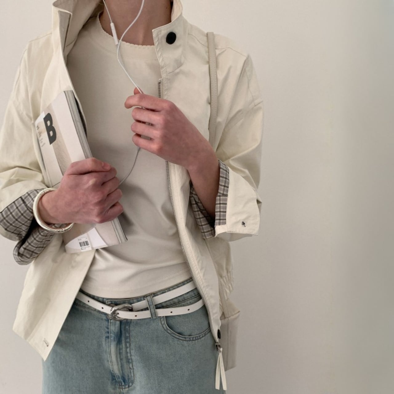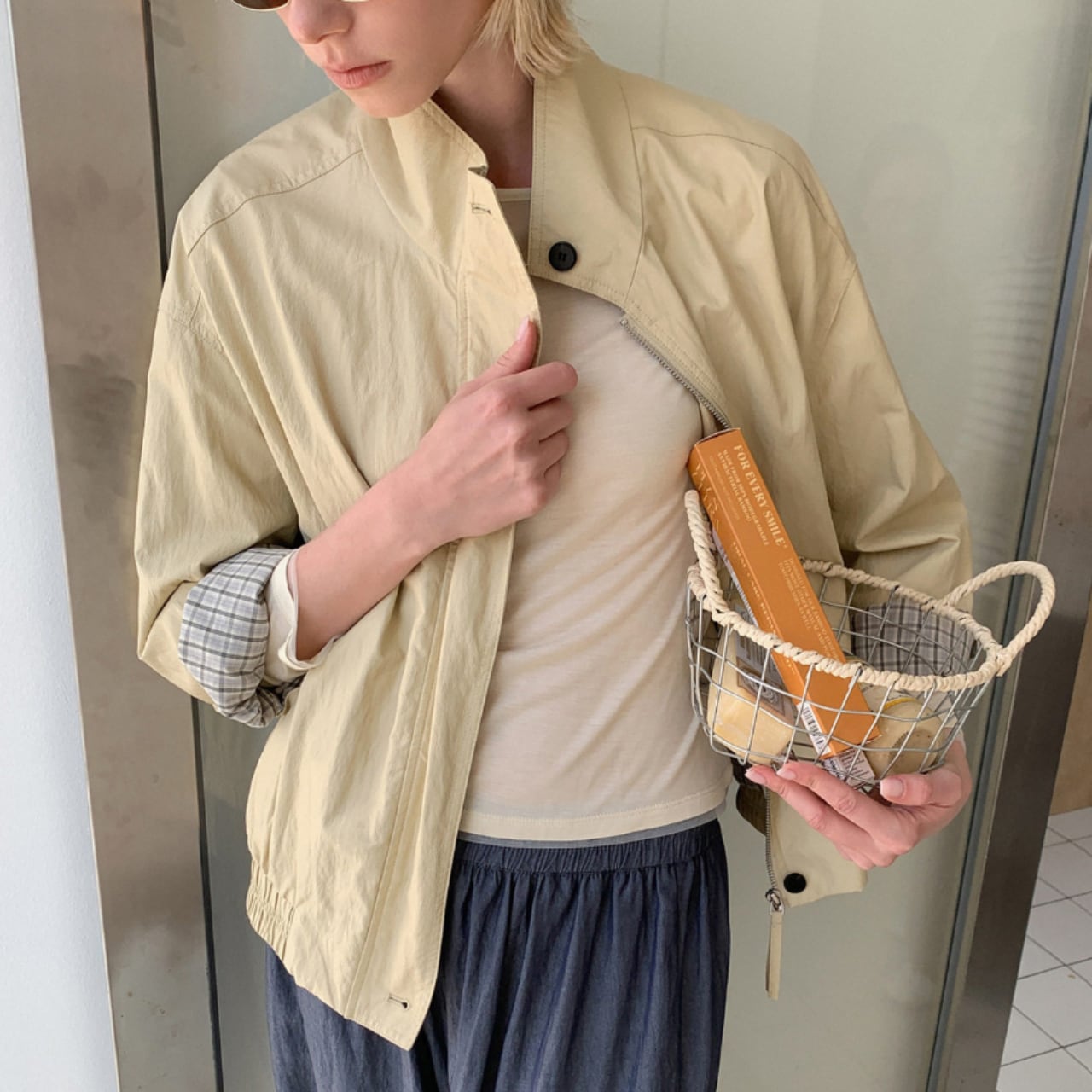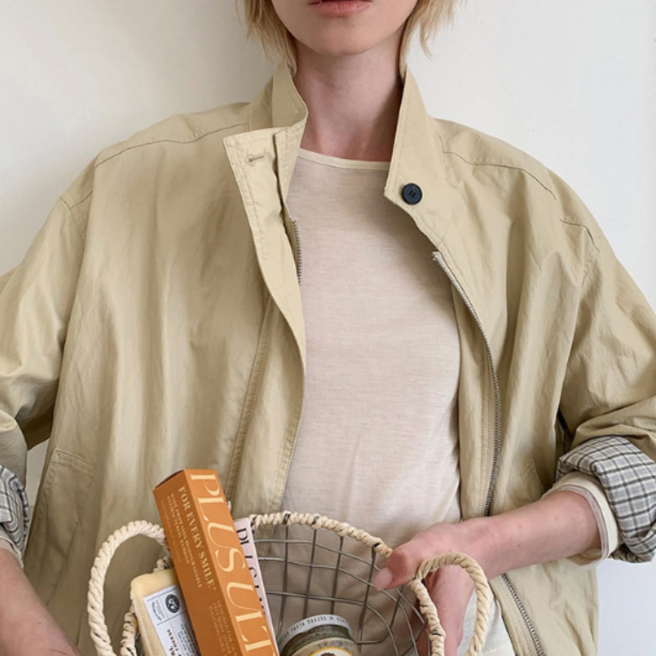 スタンドカラーで首元はすっきりと収まり、全体はゆとりを持たせたシルエット。
