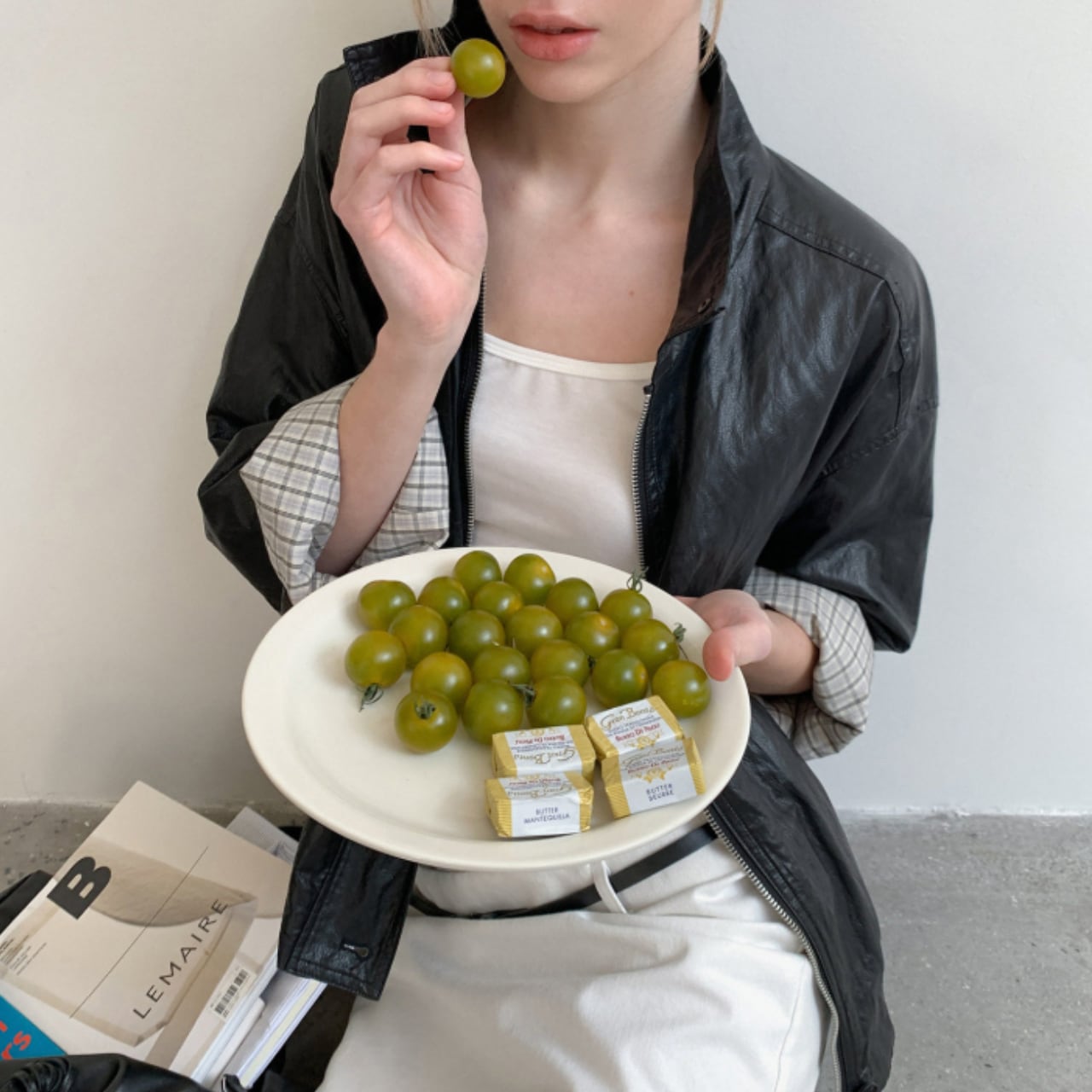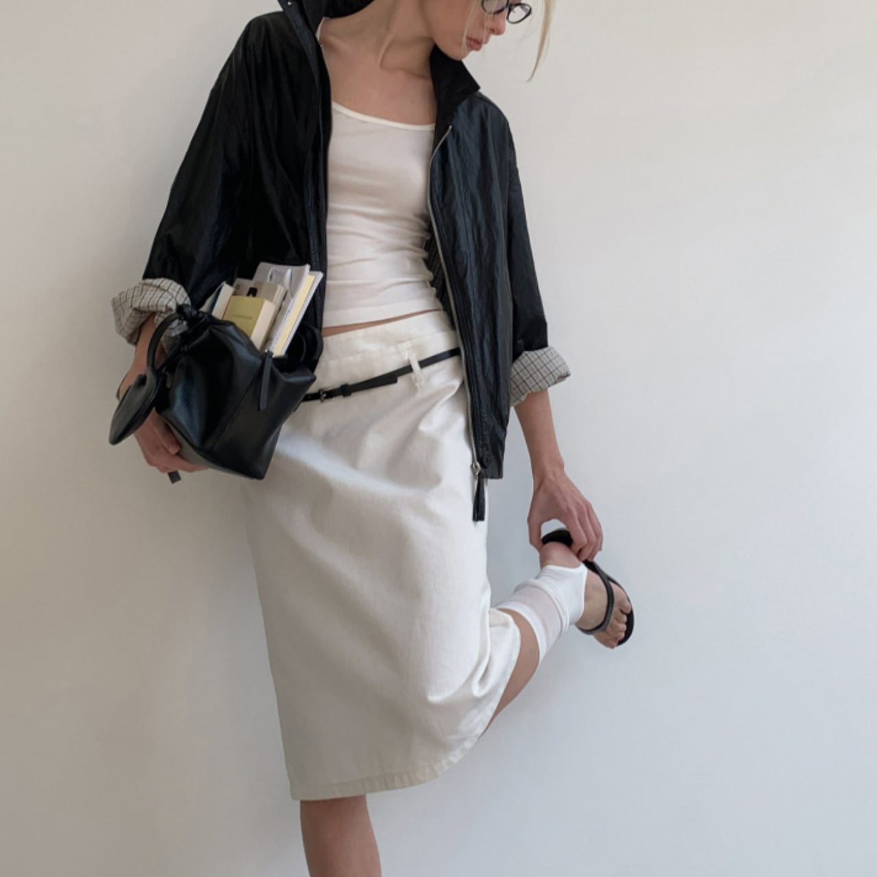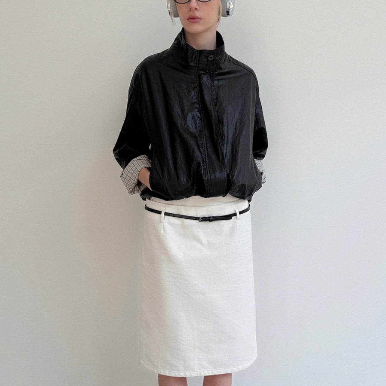やや光沢のある質感が、カジュアルに寄りすぎず、全体を引き締めます。