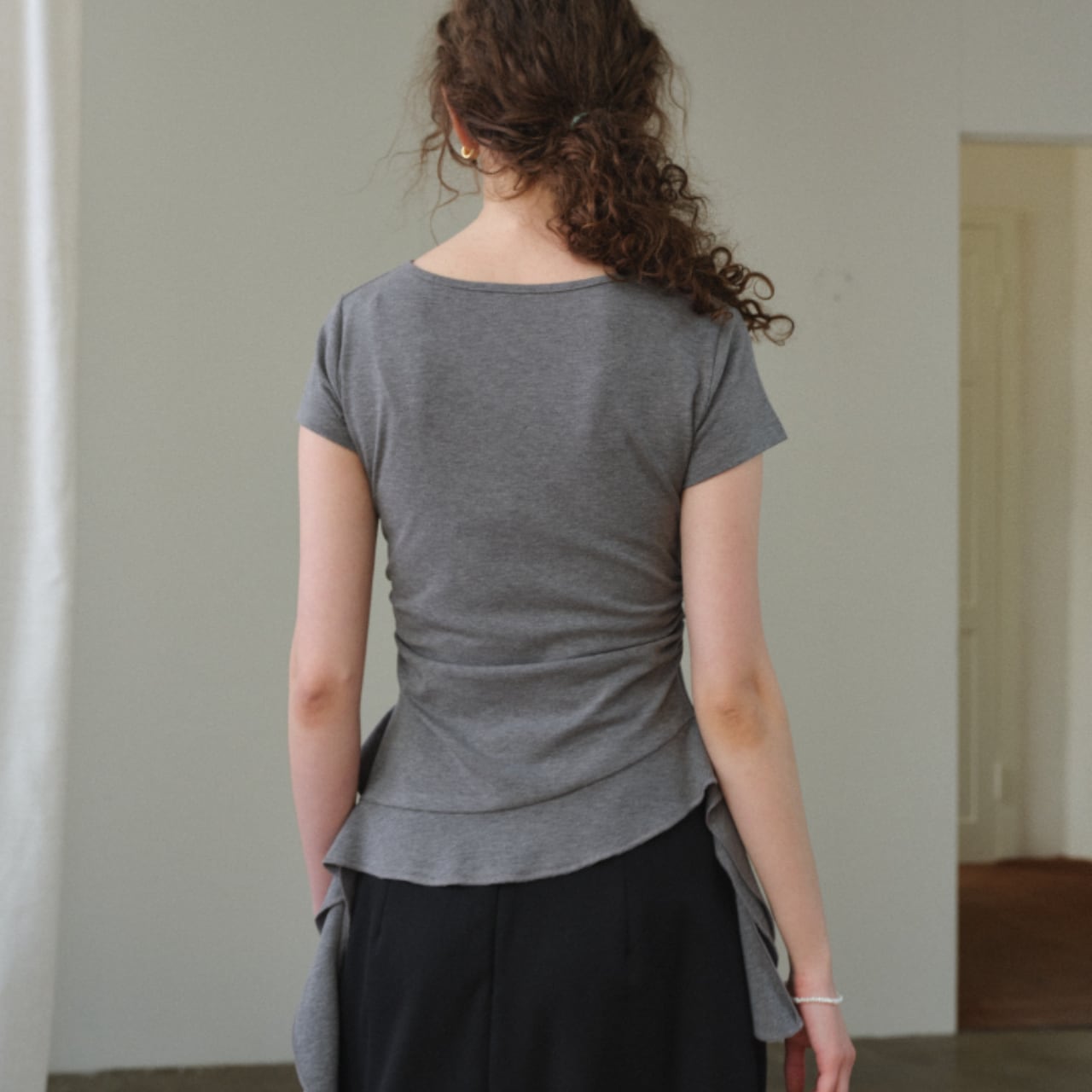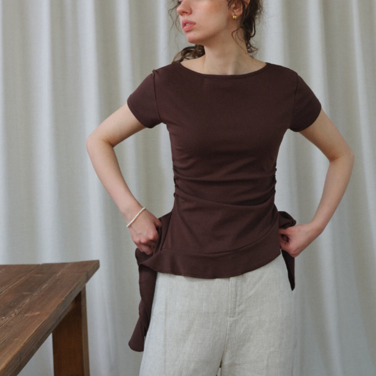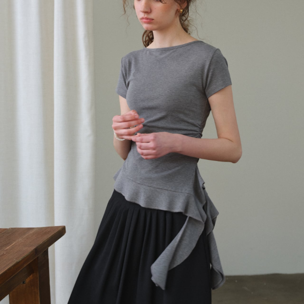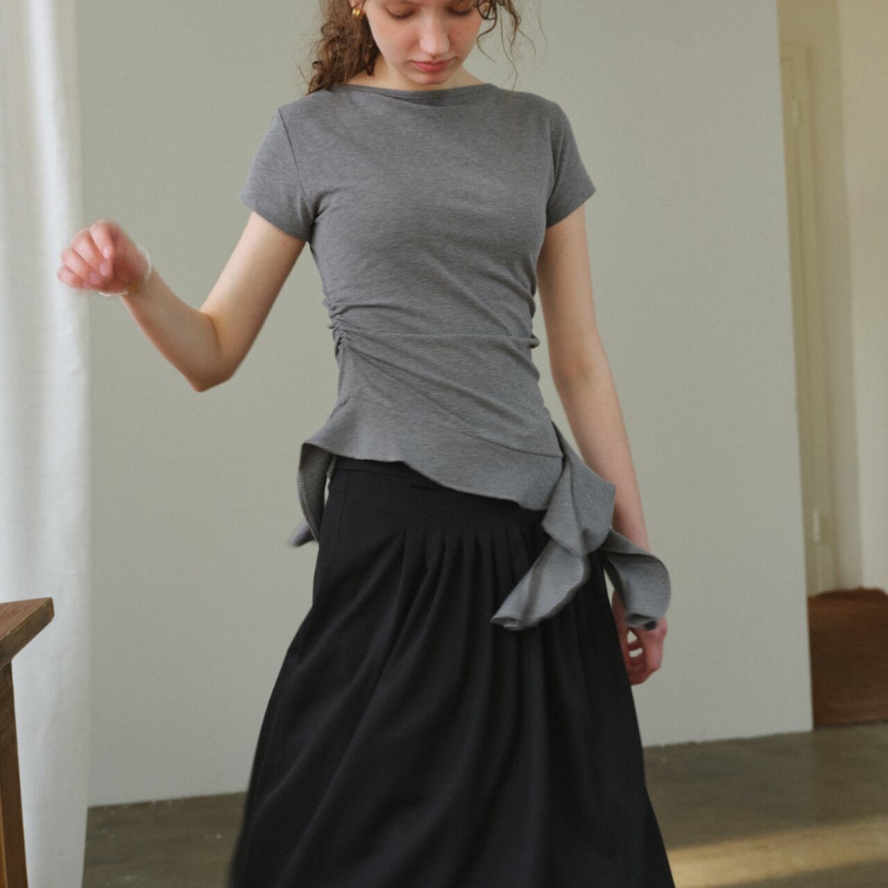 左右で少し表情の違うアシンメトリーの裾が、動くたびに軽く揺れて、シンプルな中に変化をつくります。