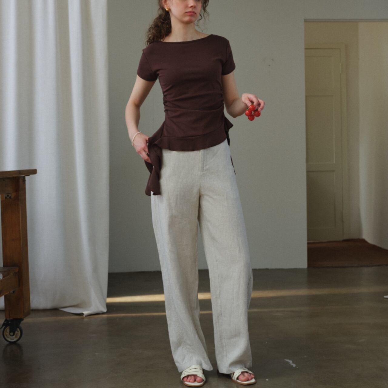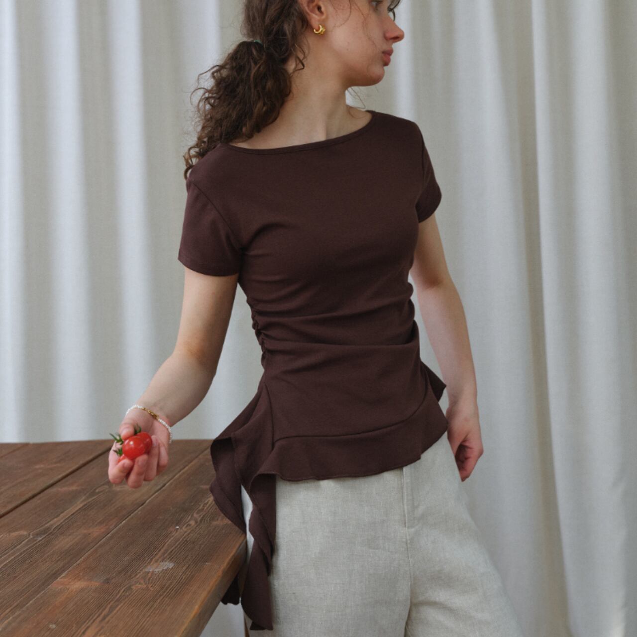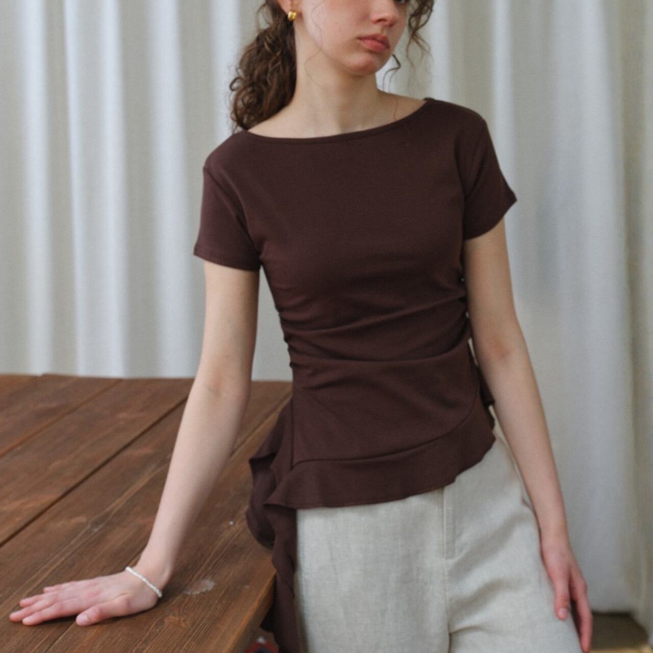 左右で少し表情の違うアシンメトリーの裾が、動くたびに軽く揺れて、シンプルな中に変化をつくります。