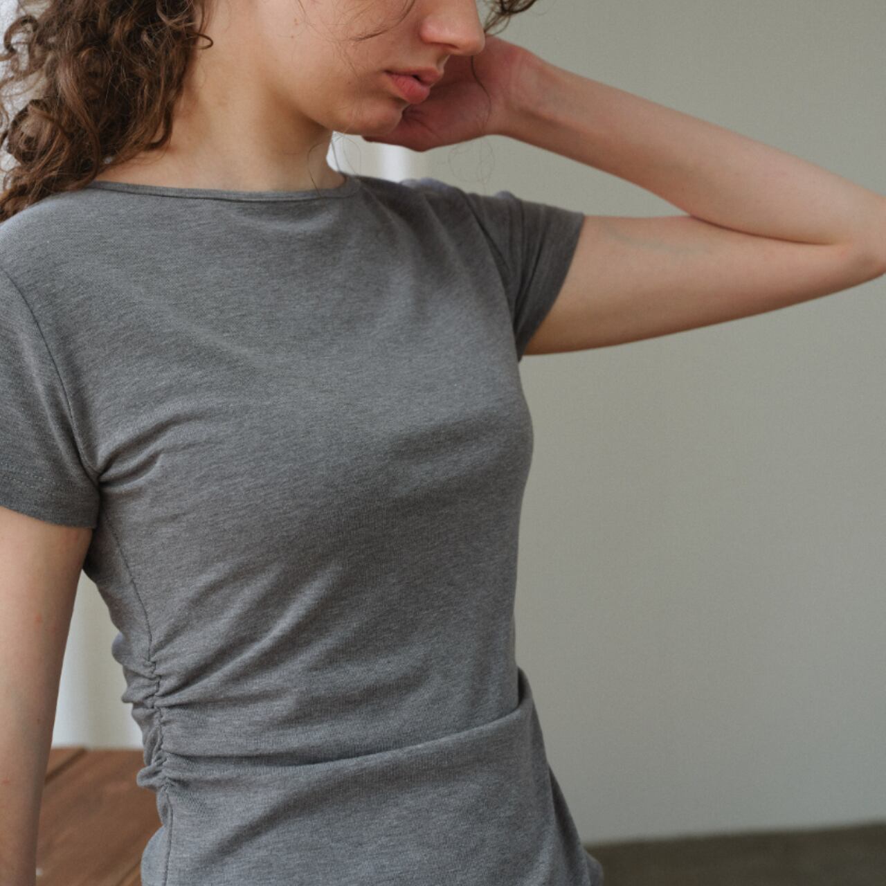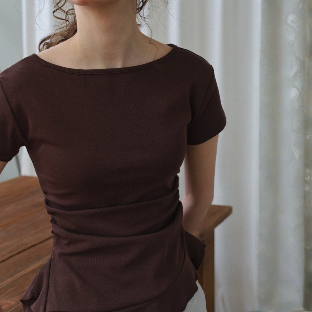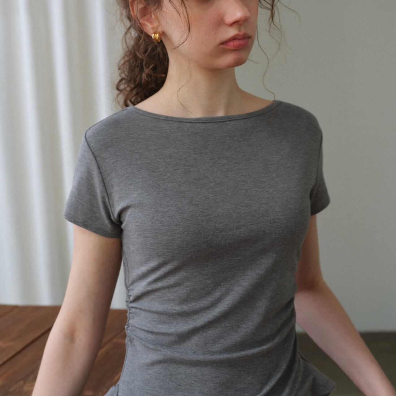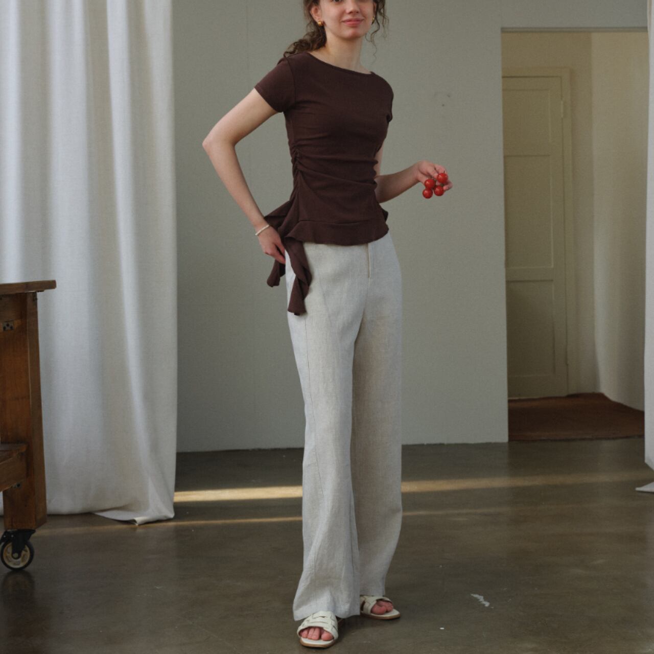 左右で少し表情の違うアシンメトリーの裾が、動くたびに軽く揺れて、シンプルな中に変化をつくります。
