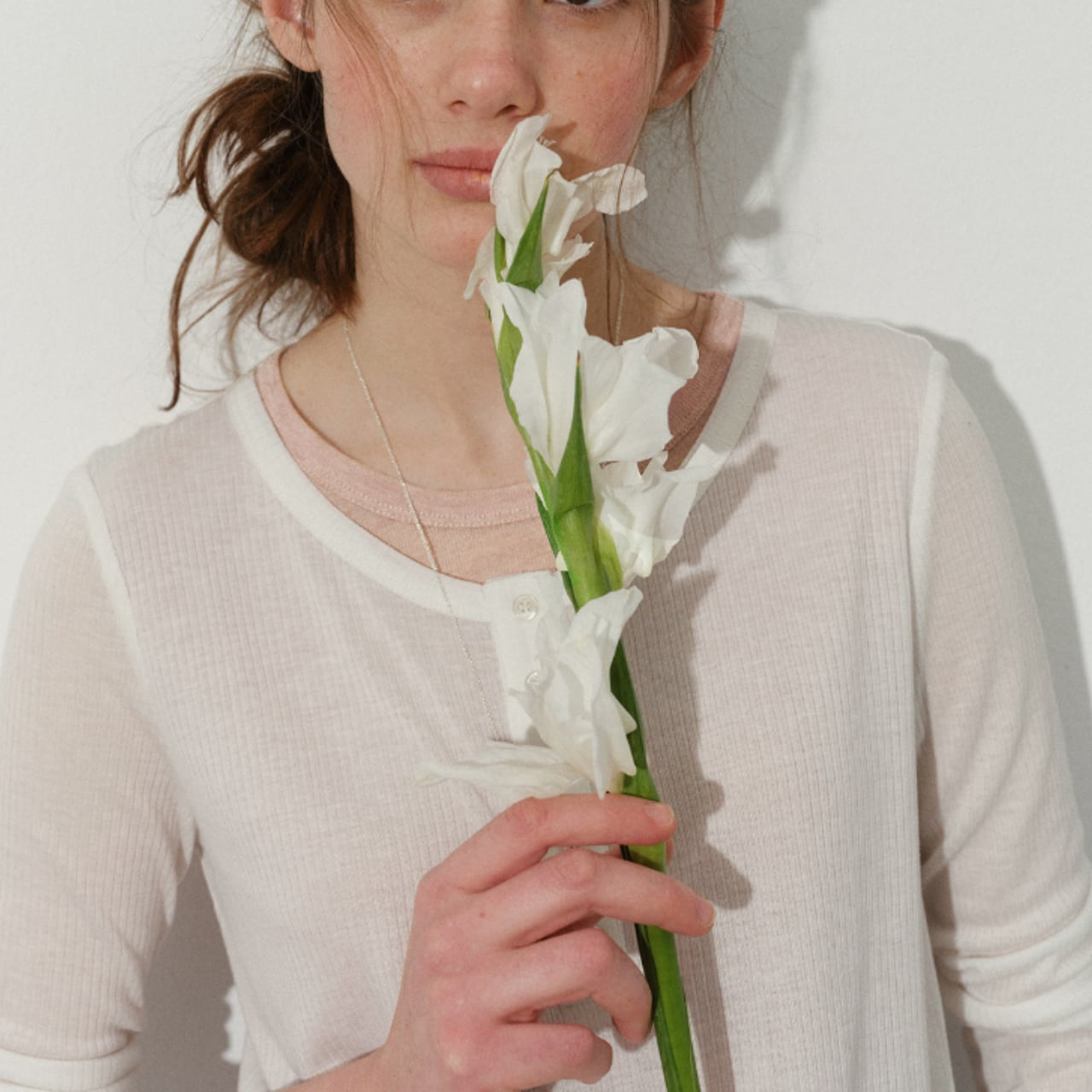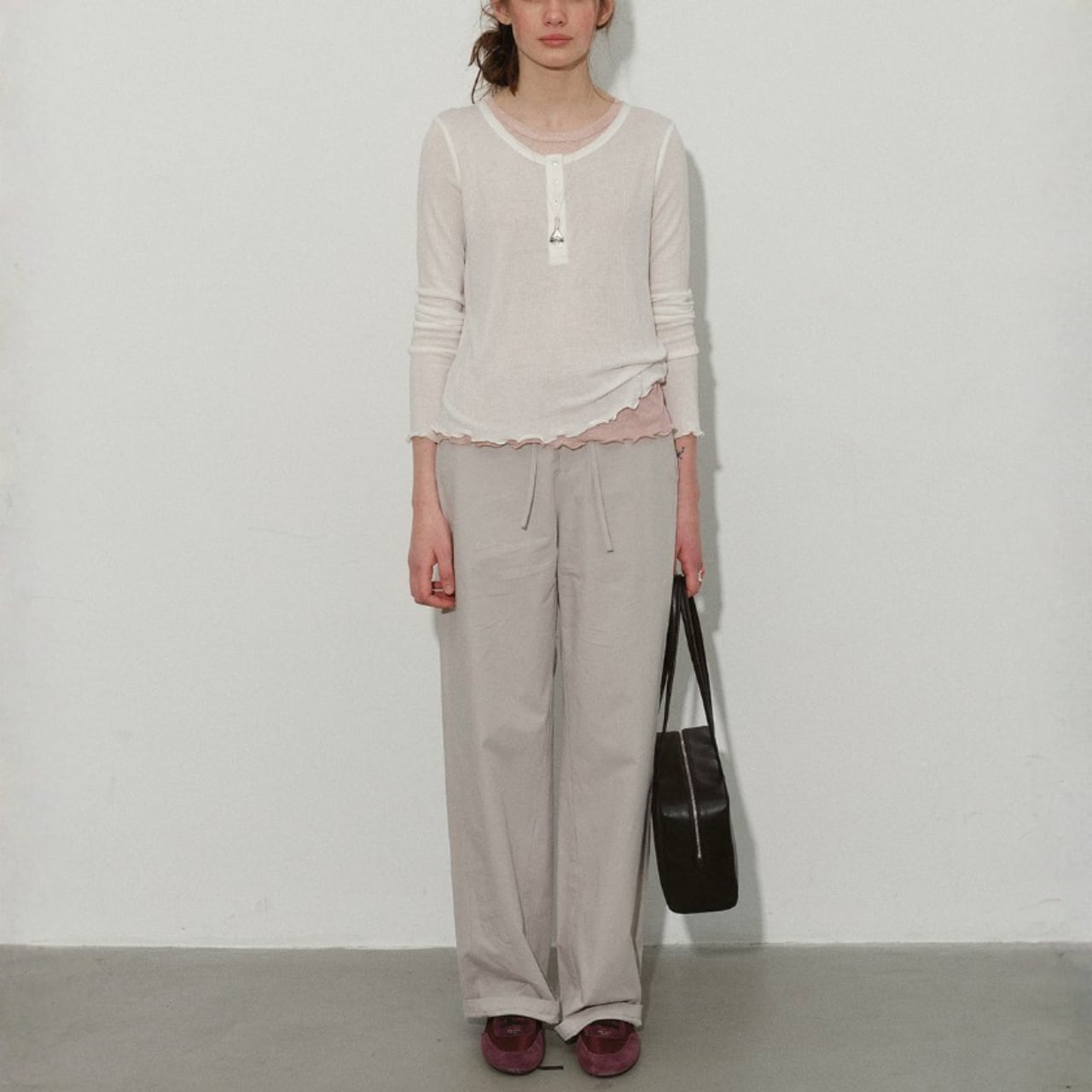 フロントのヘンリーボタンが抜け感を添え、首元はすっきりと軽やか。