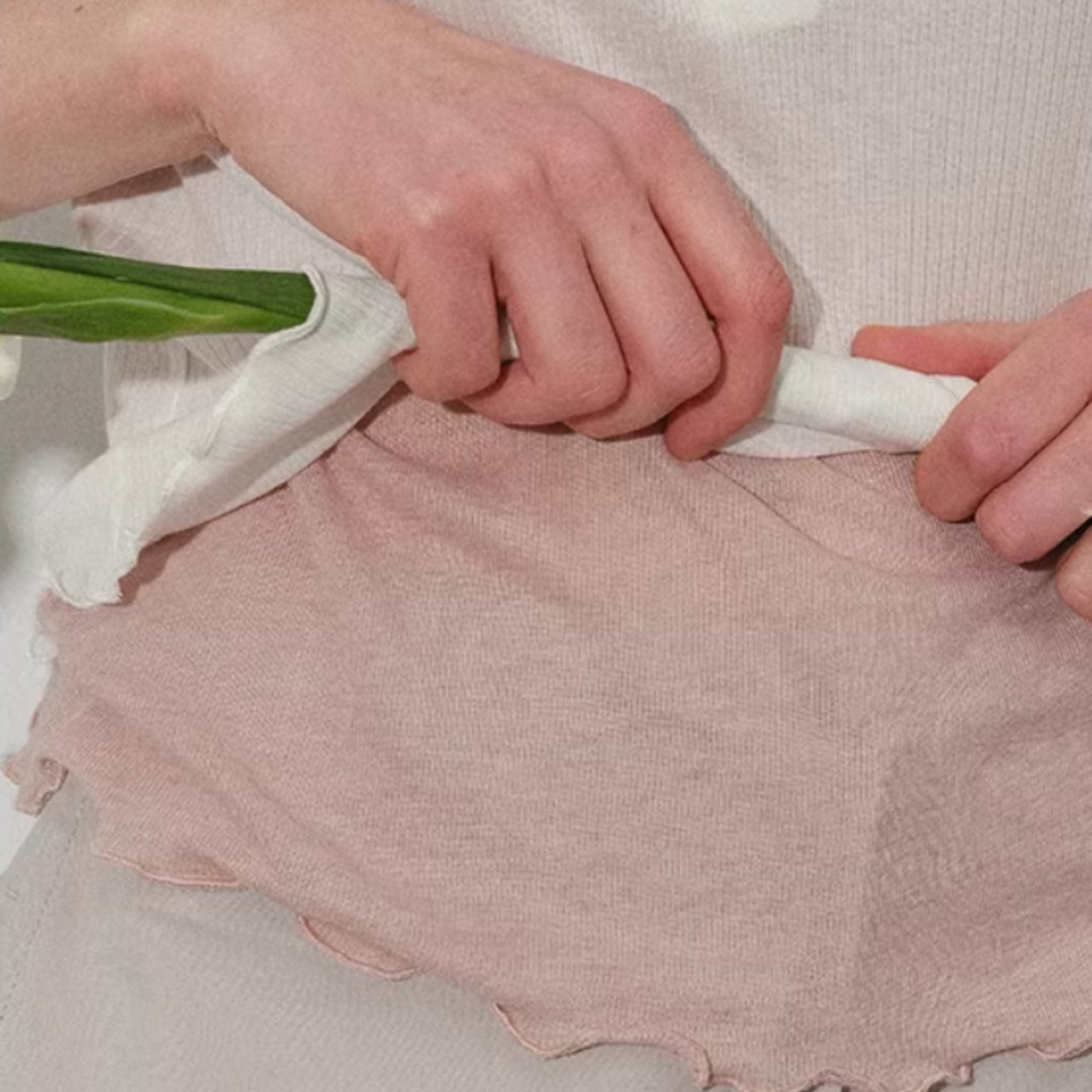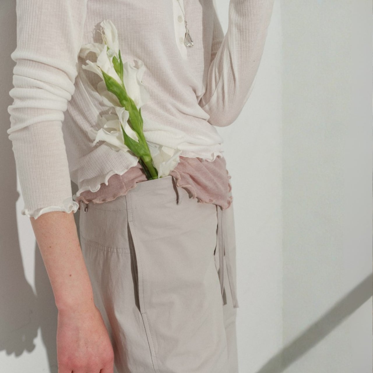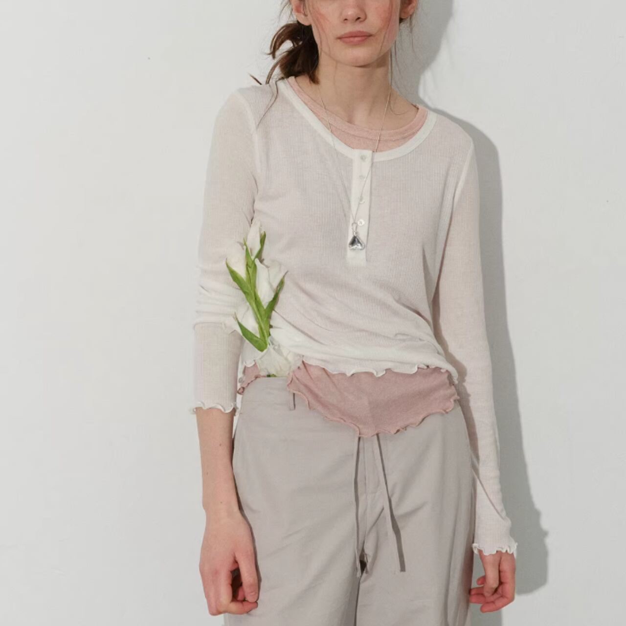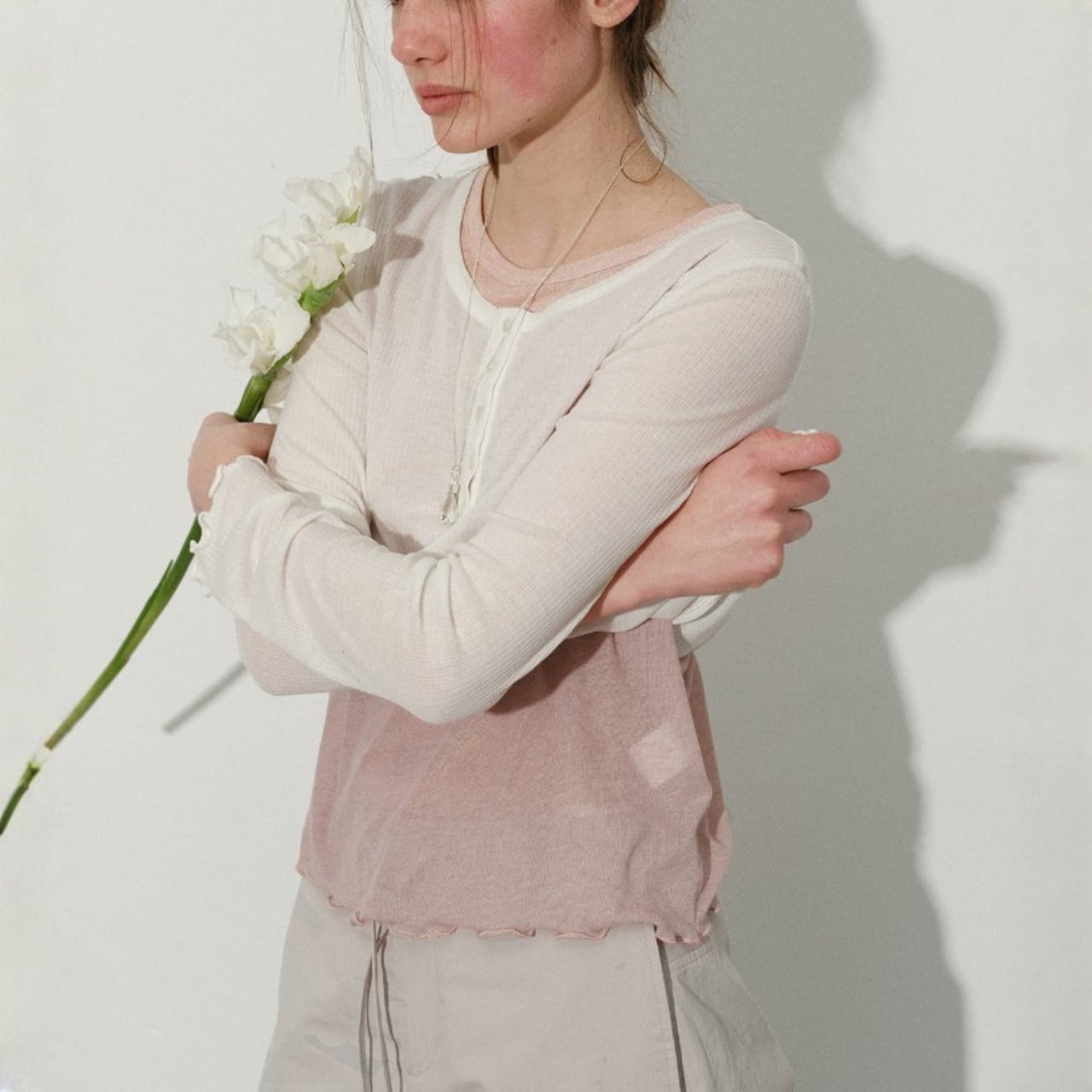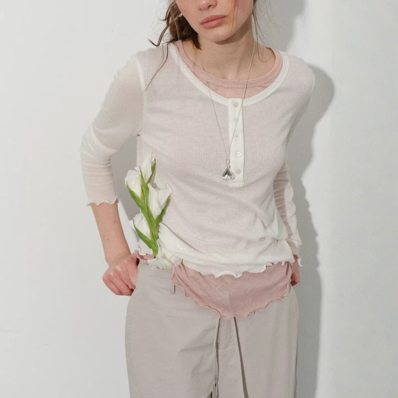 薄くやわらかなトップスに、裾と袖口からのぞくフリルのレイヤードが印象的な一枚。