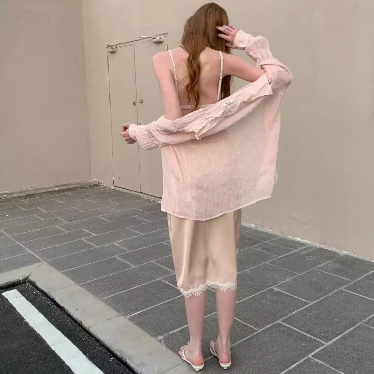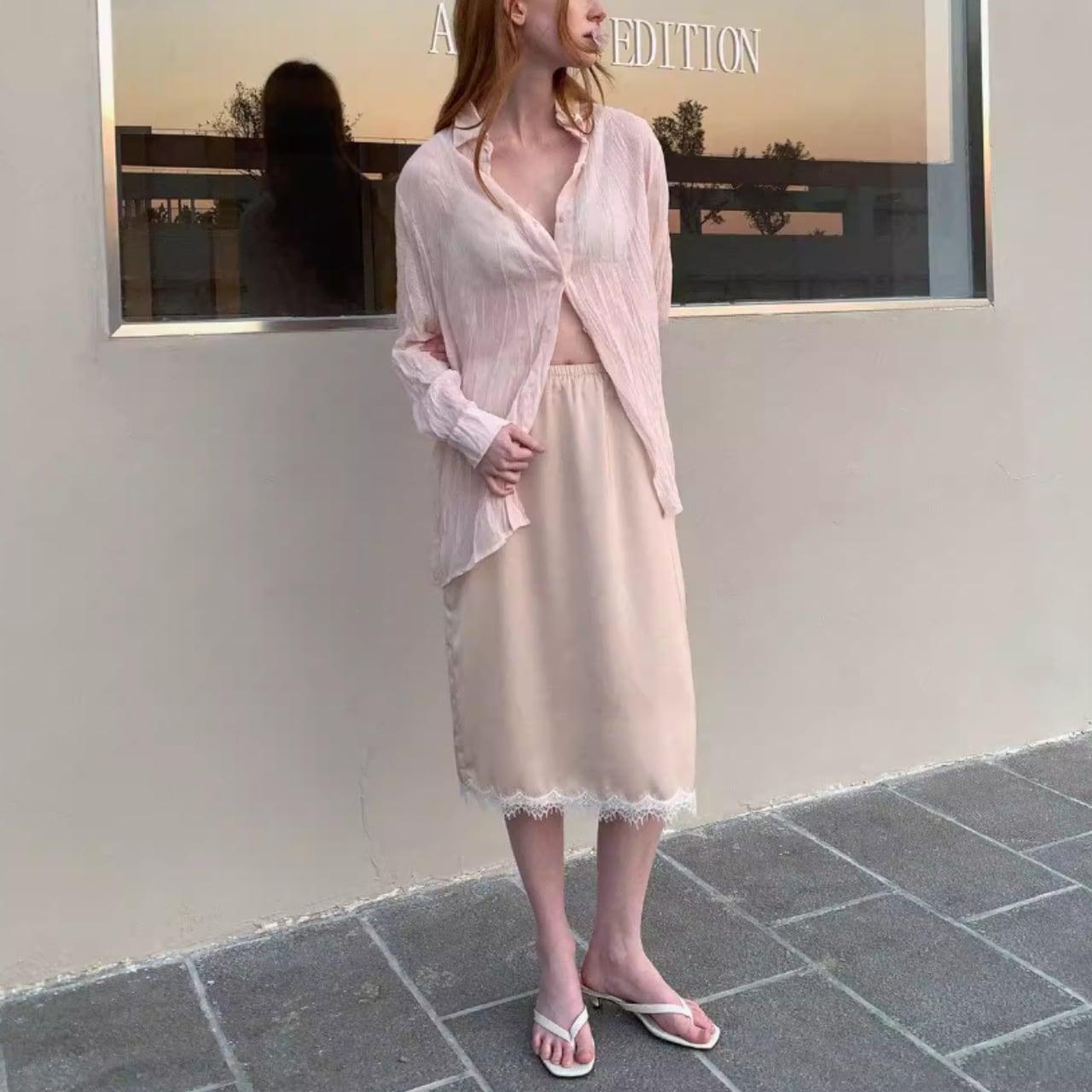デニムからスラックス、WEEKEND DIARYのサテンスカートに合わせると寄り雰囲気のある着こなしに。