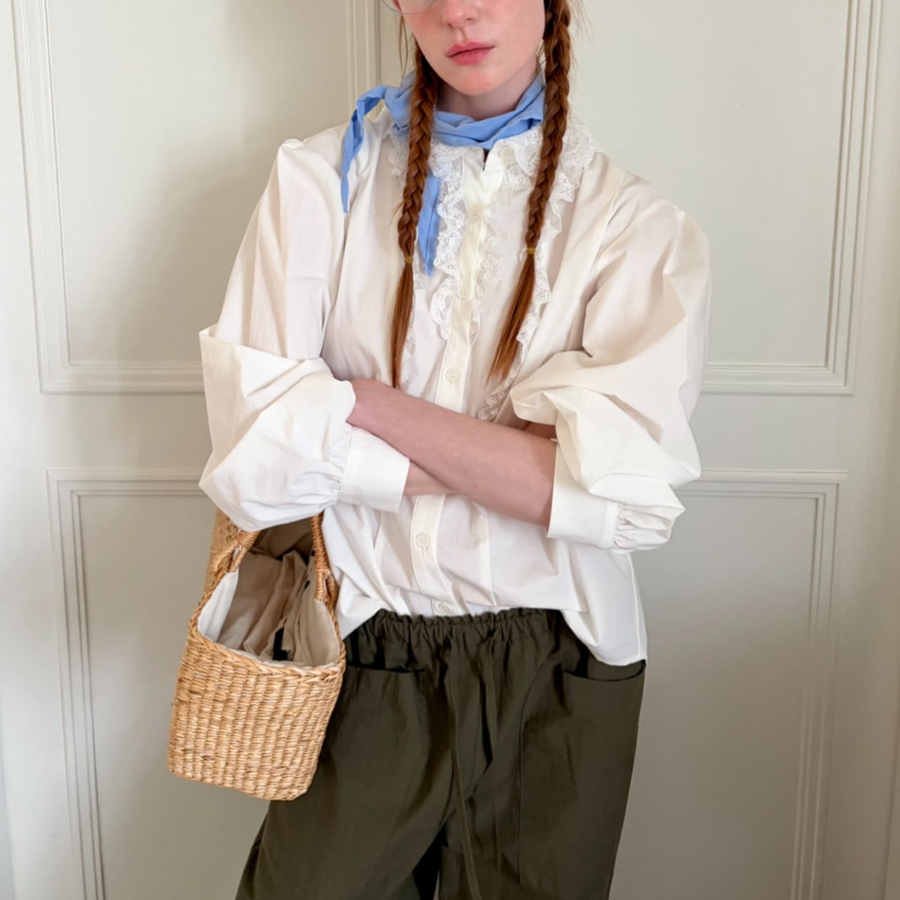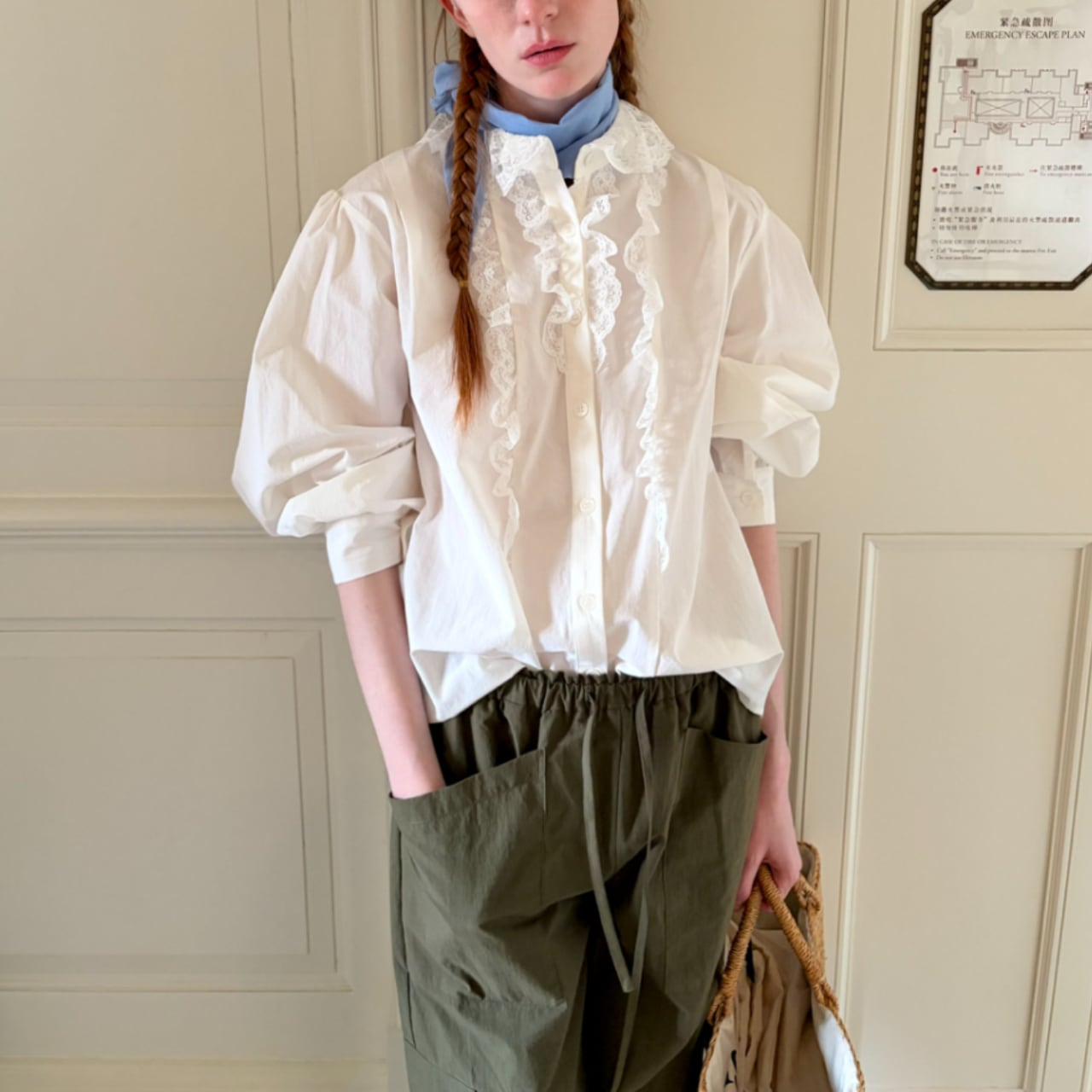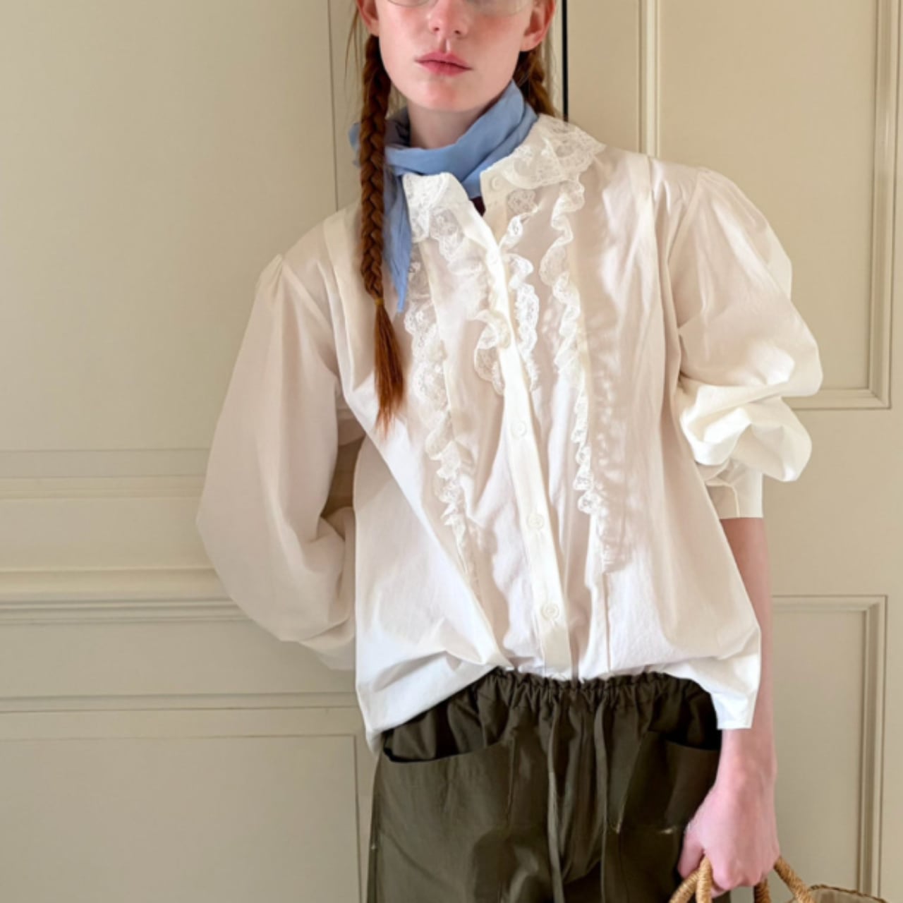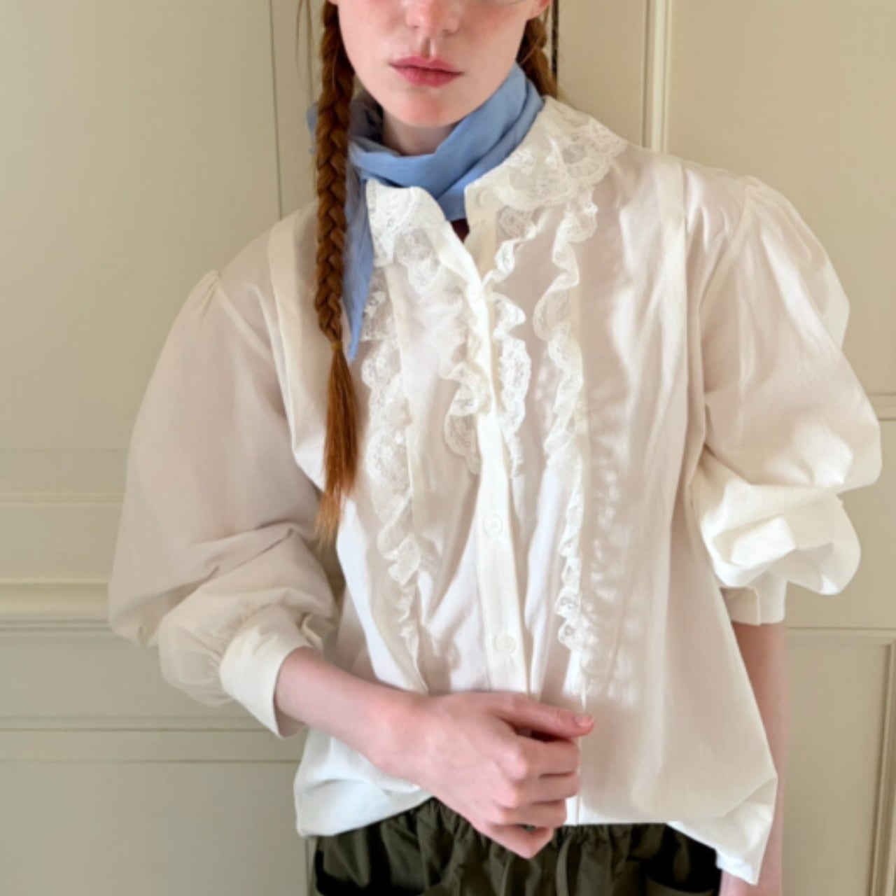 襟元からフロントにかけて重ねられたレースが印象に残るブラウス。