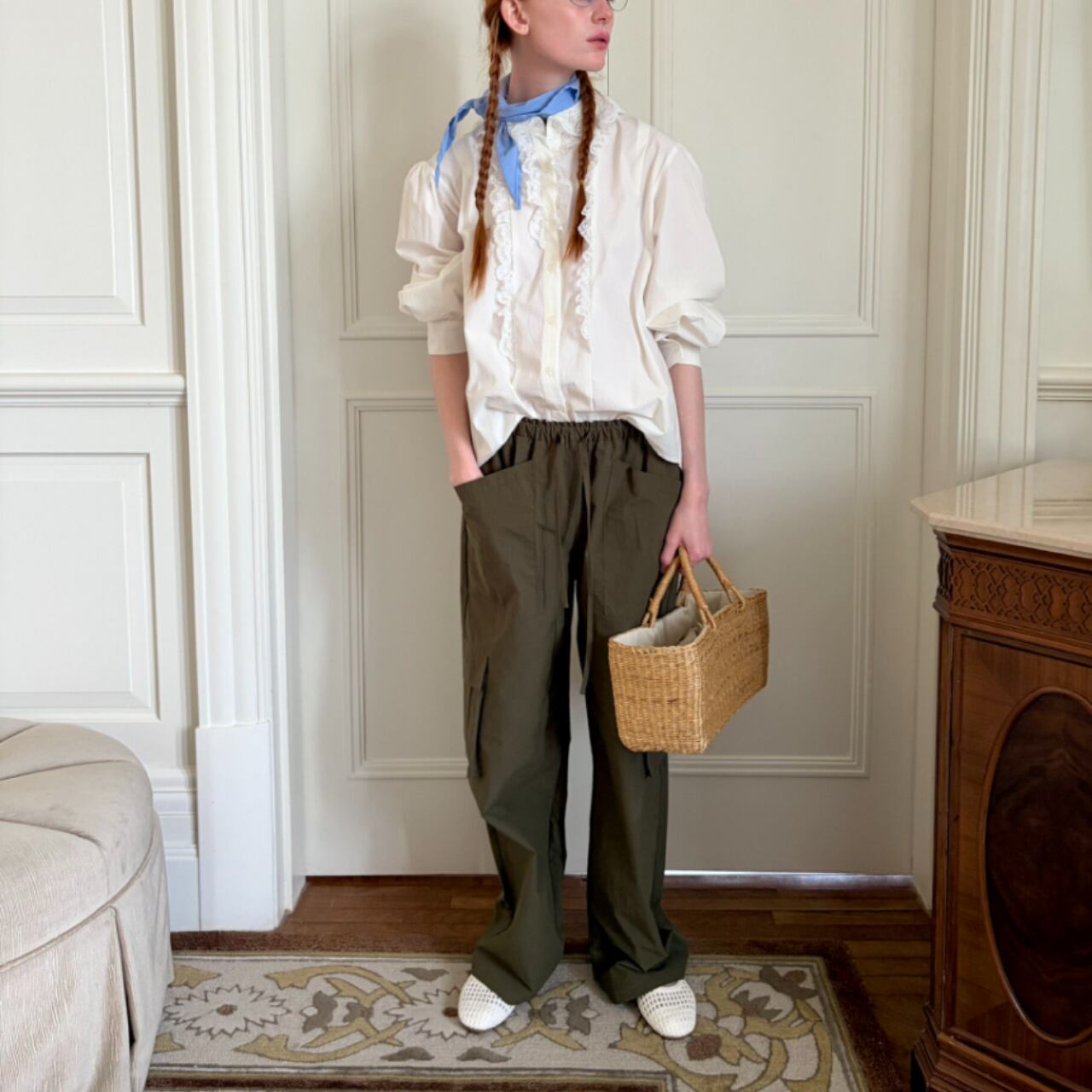 カーゴパンツのようなラフなアイテムと合わせると、甘さが強くなりすぎず、ちょうどいい抜けが生まれます。