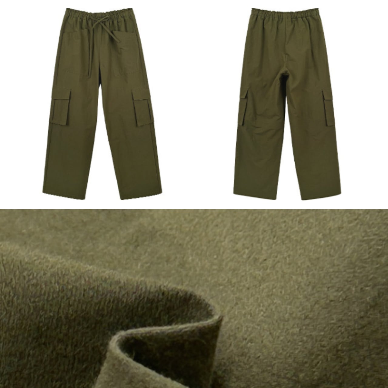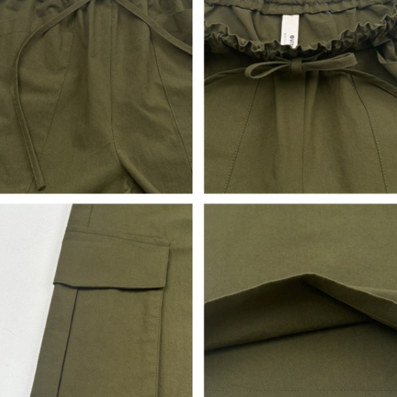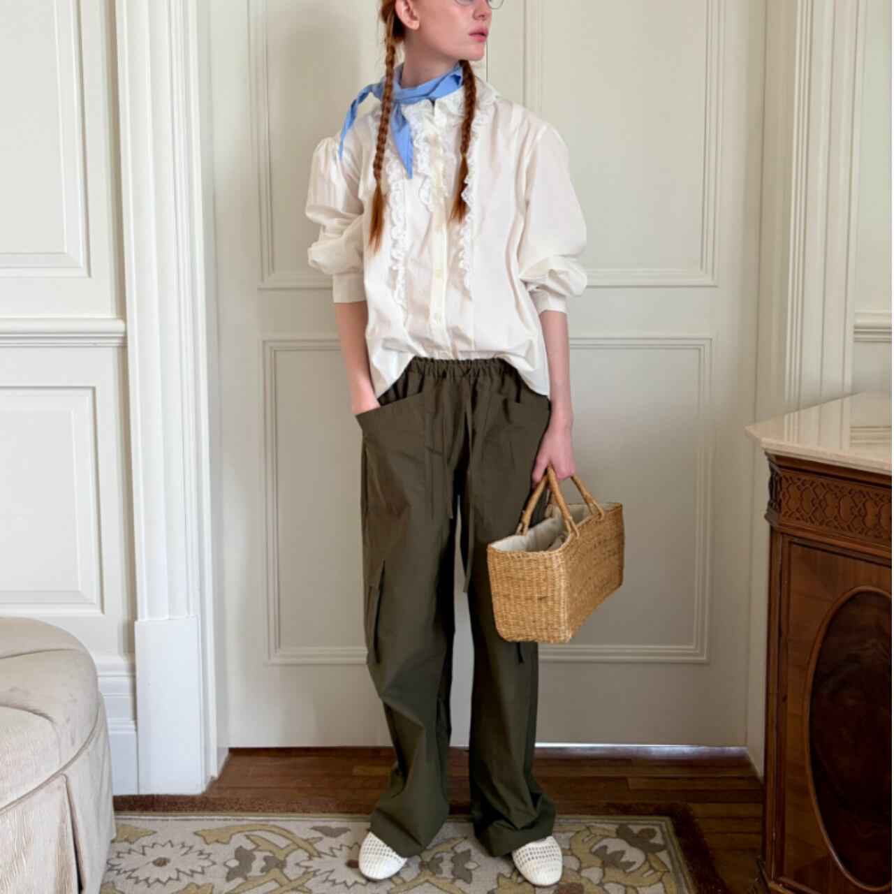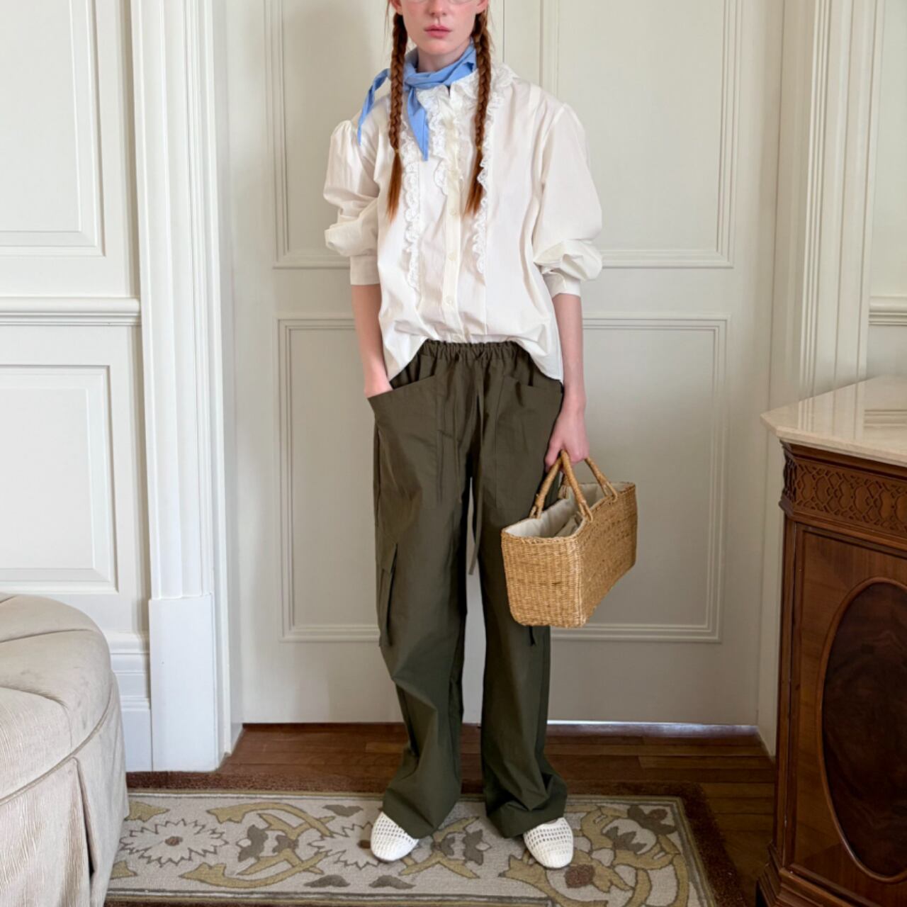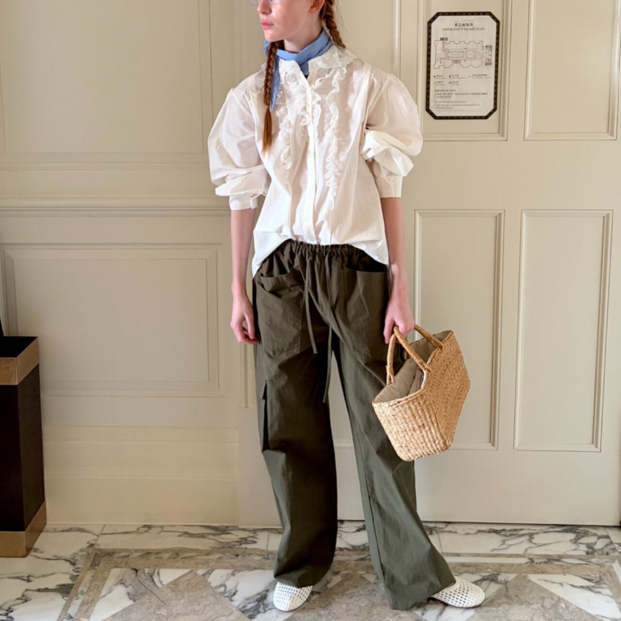 カーゴ特有のディテールは残しつつ、無骨になりすぎない仕上がりで、ブラウスのような柔らかいアイテムとも無理なく馴染む一本。