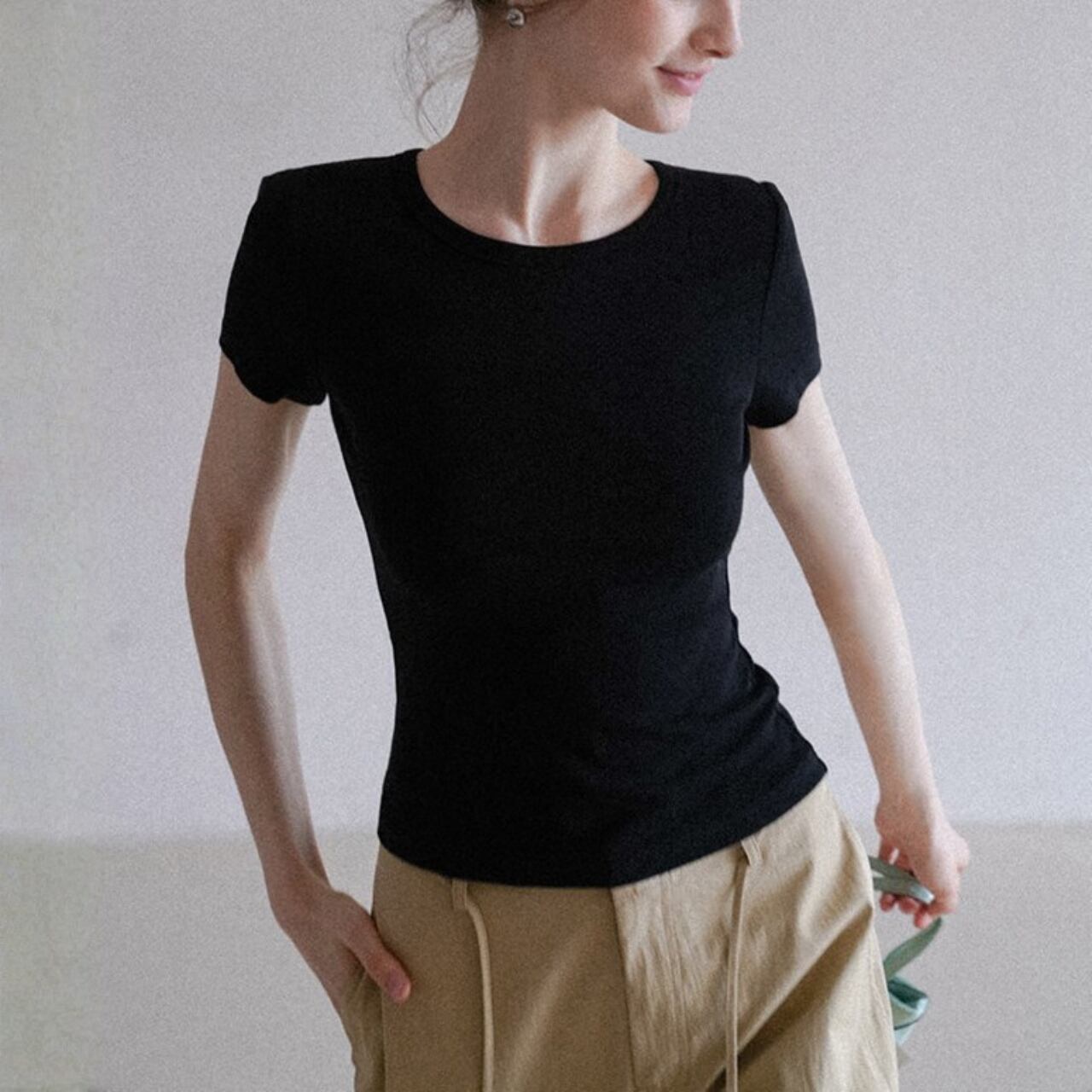カットアウトと細いリボンが、シンプルなTシャツに静かな印象の変化をつくります。