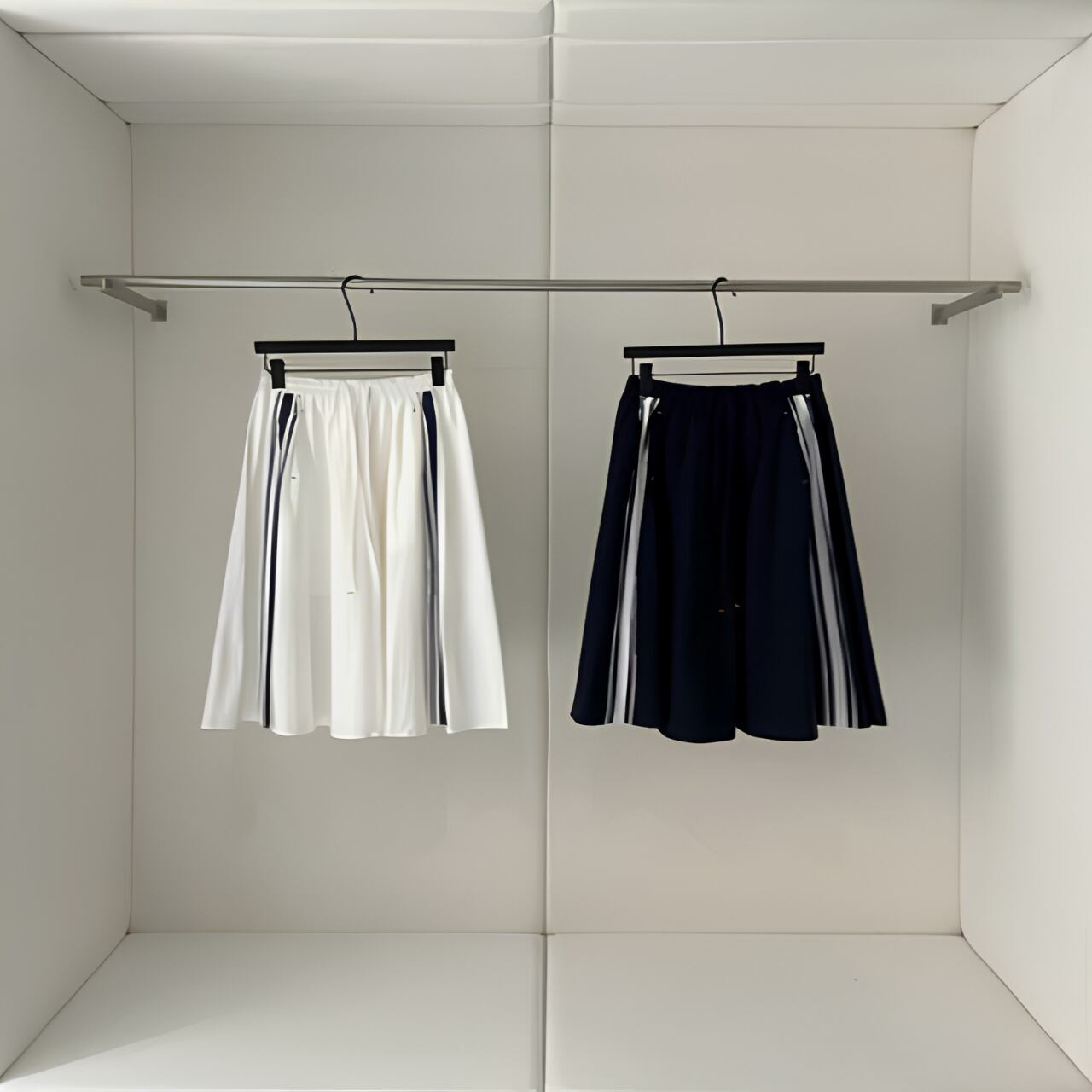 細いラインが入った生地が印象的な、Aラインシルエットのミディスカート。