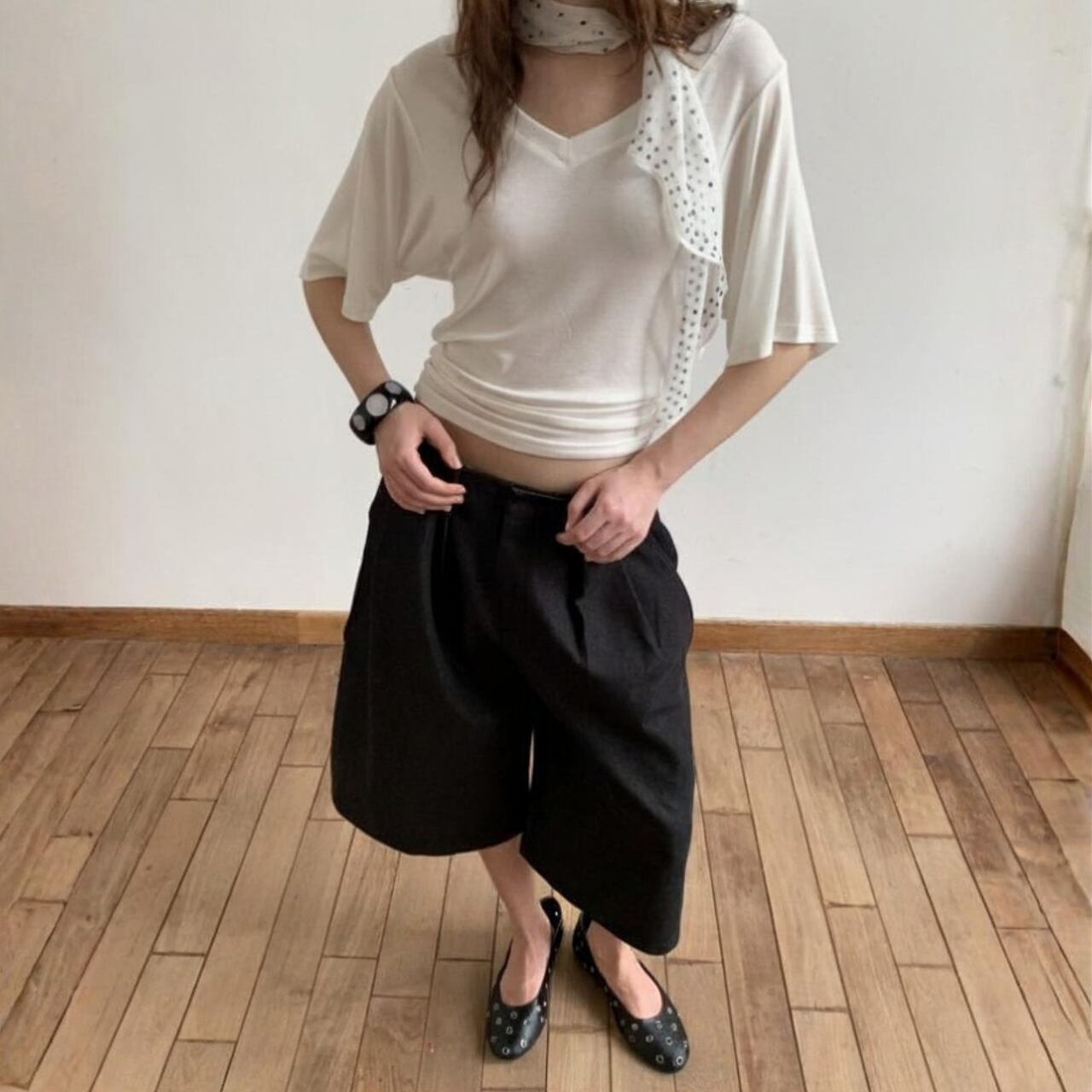 あえて腰で落として、コンパクトなトップスと合わせるバランスが今の気分。