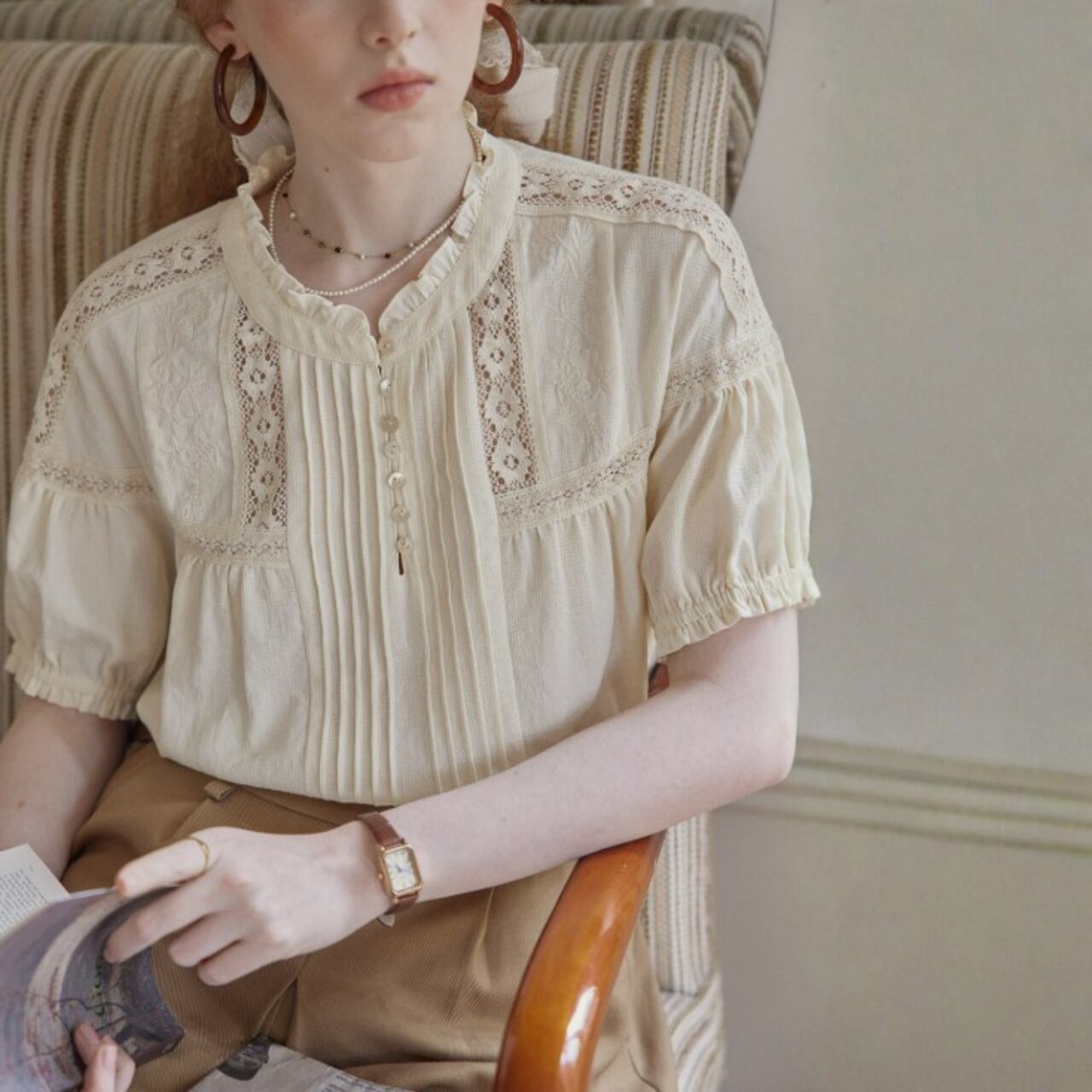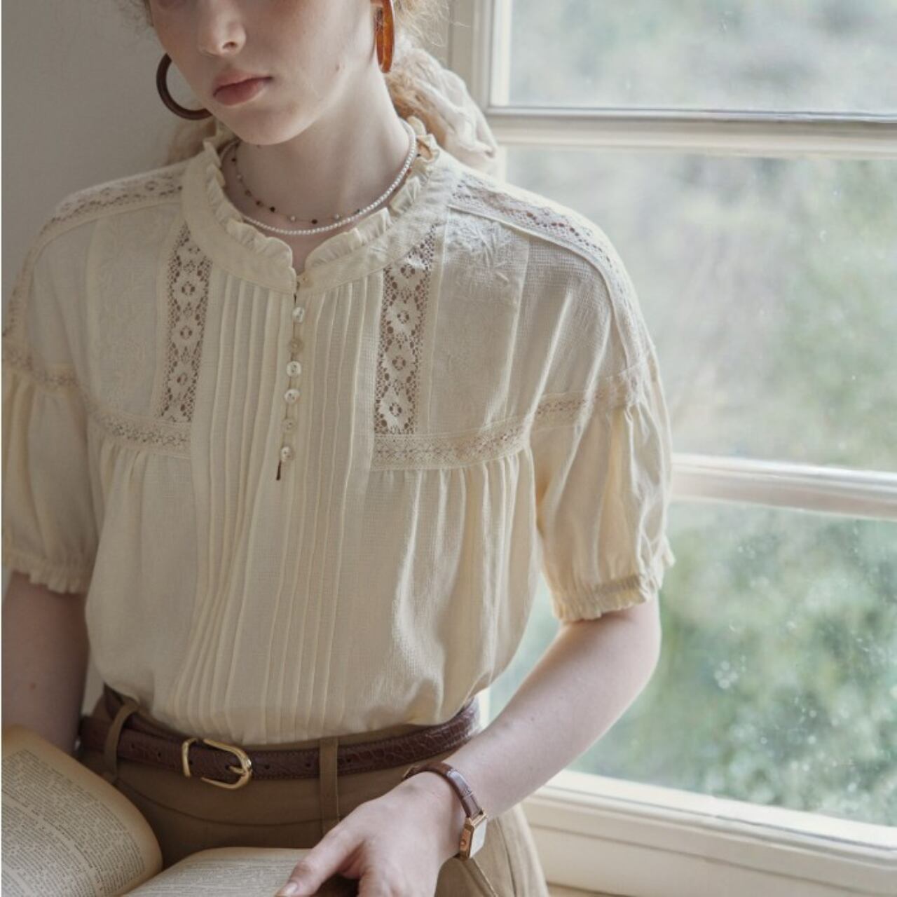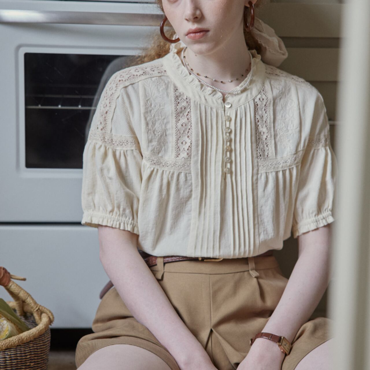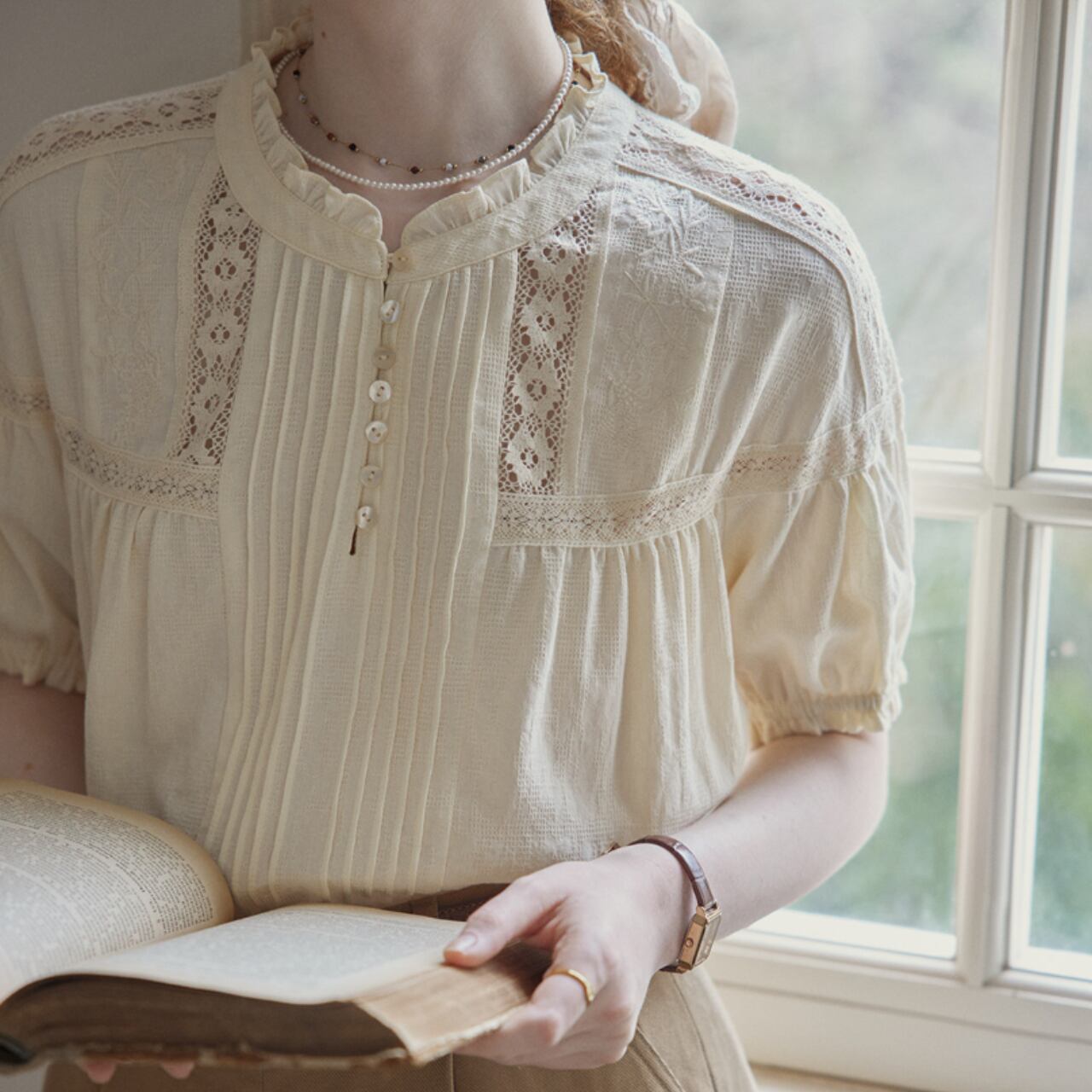 やわらかな生成りの色合いに、細かなピンタックと繊細なレースを重ねた一着。