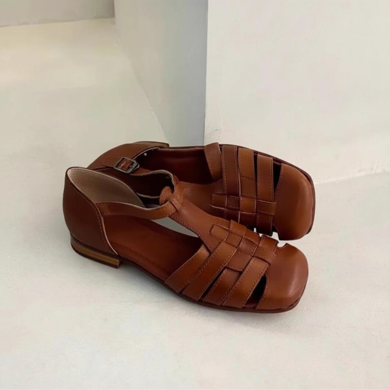 編み込みが印象的な、クラシカルな佇まいのサンダル。