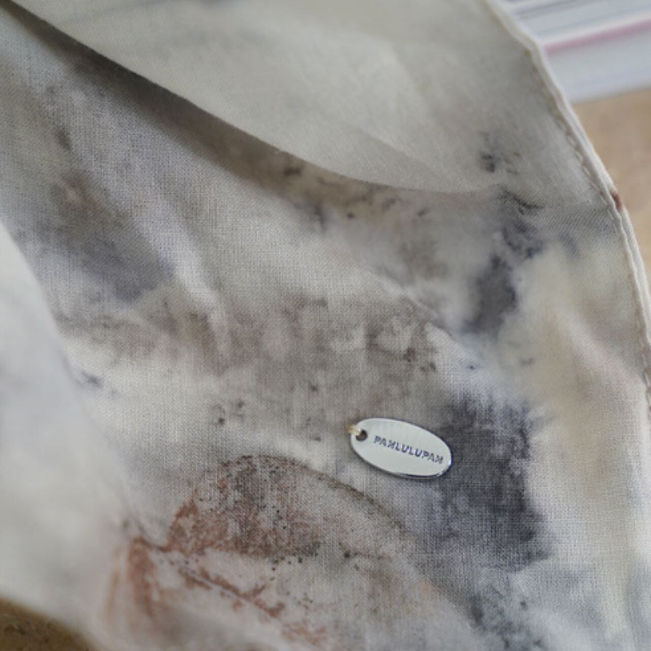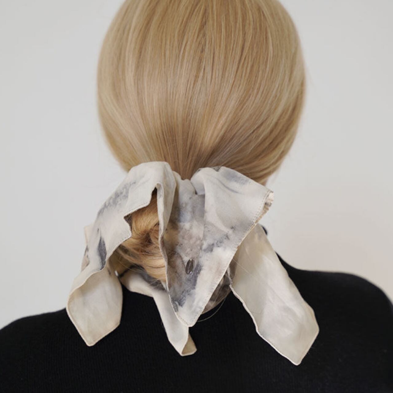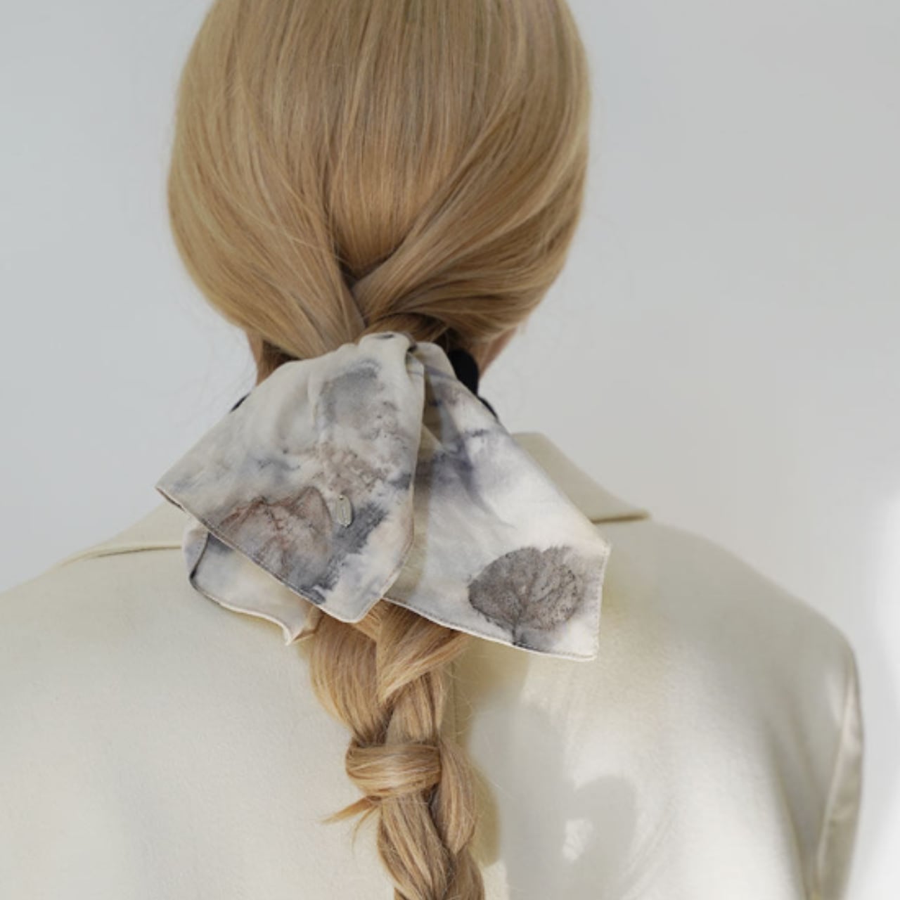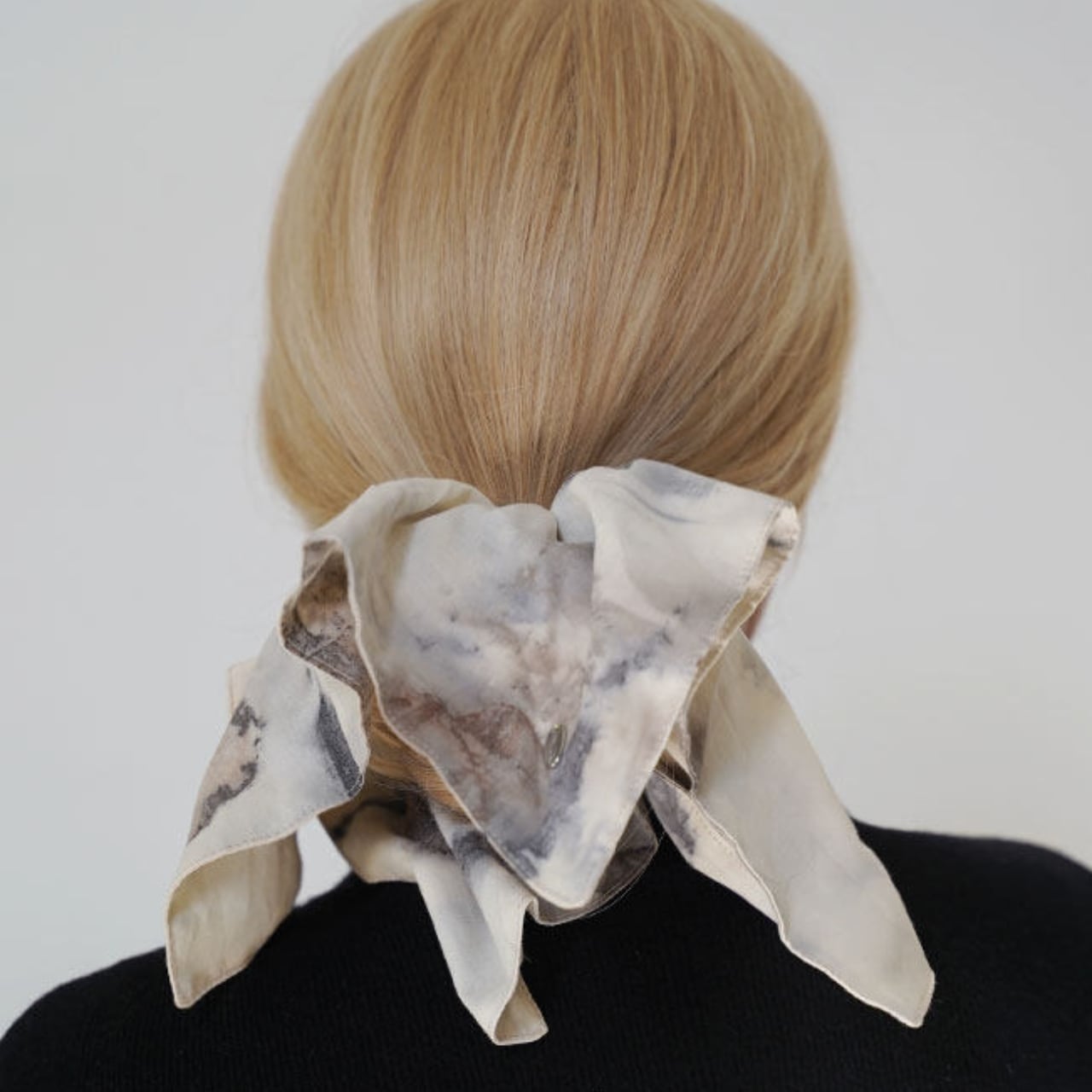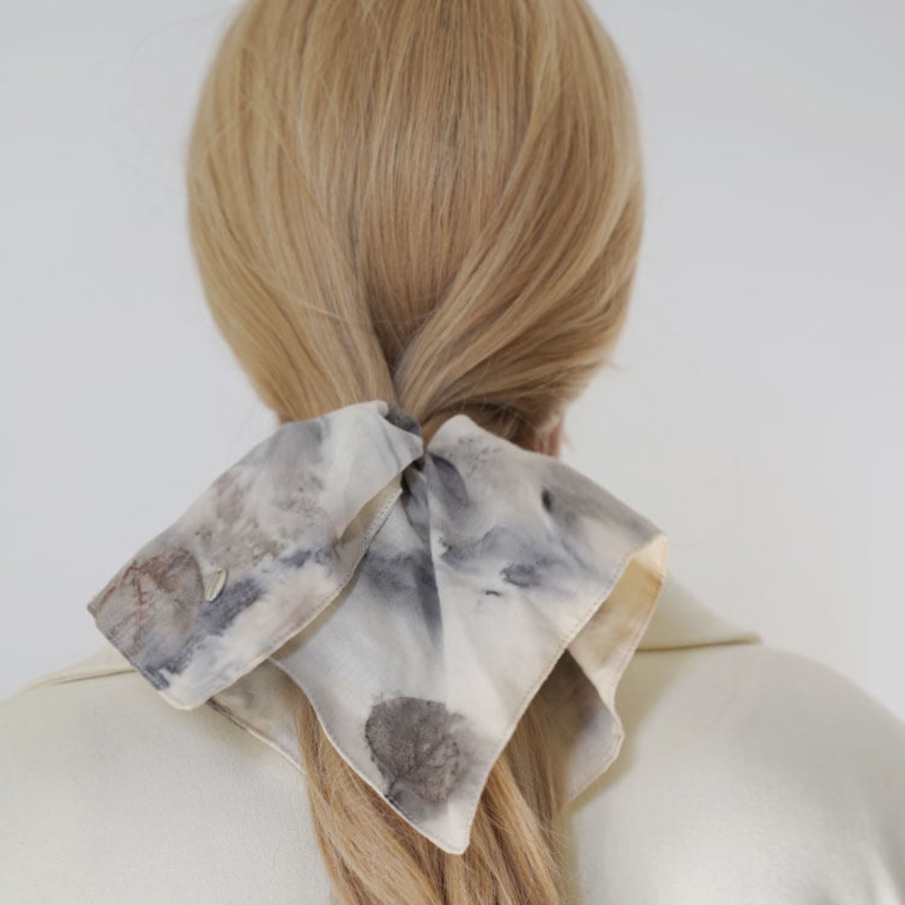 淡くにじむような模様が、どこか記憶の断片のように残るヘアスカーフ。