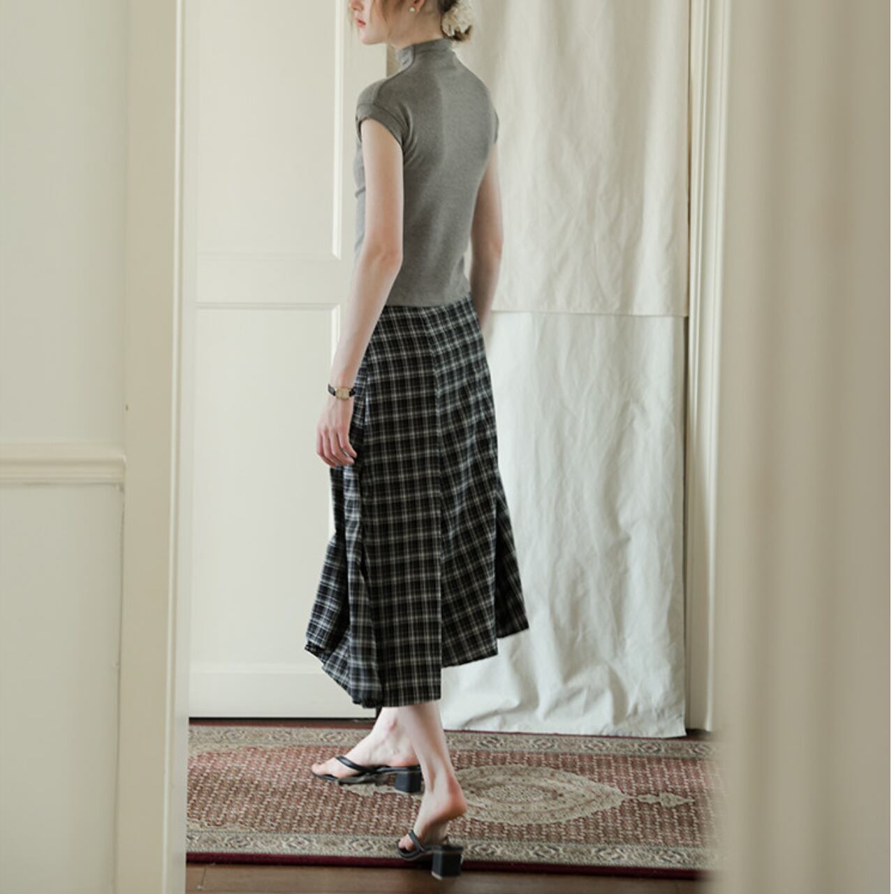 ウエストから裾にかけて、パーツごとに切り替えられた構造で、歩くたびに自然に広がるラインが特徴です。