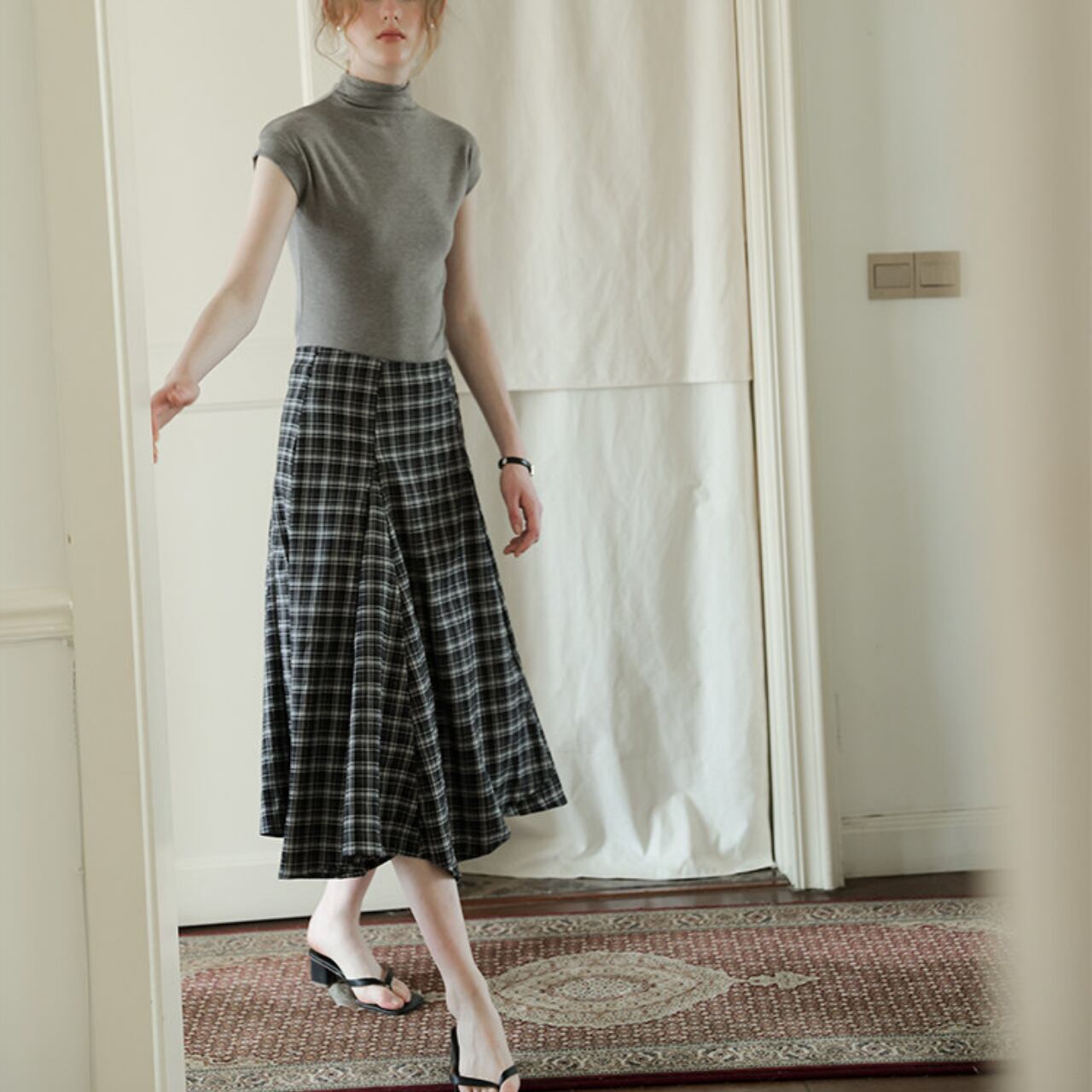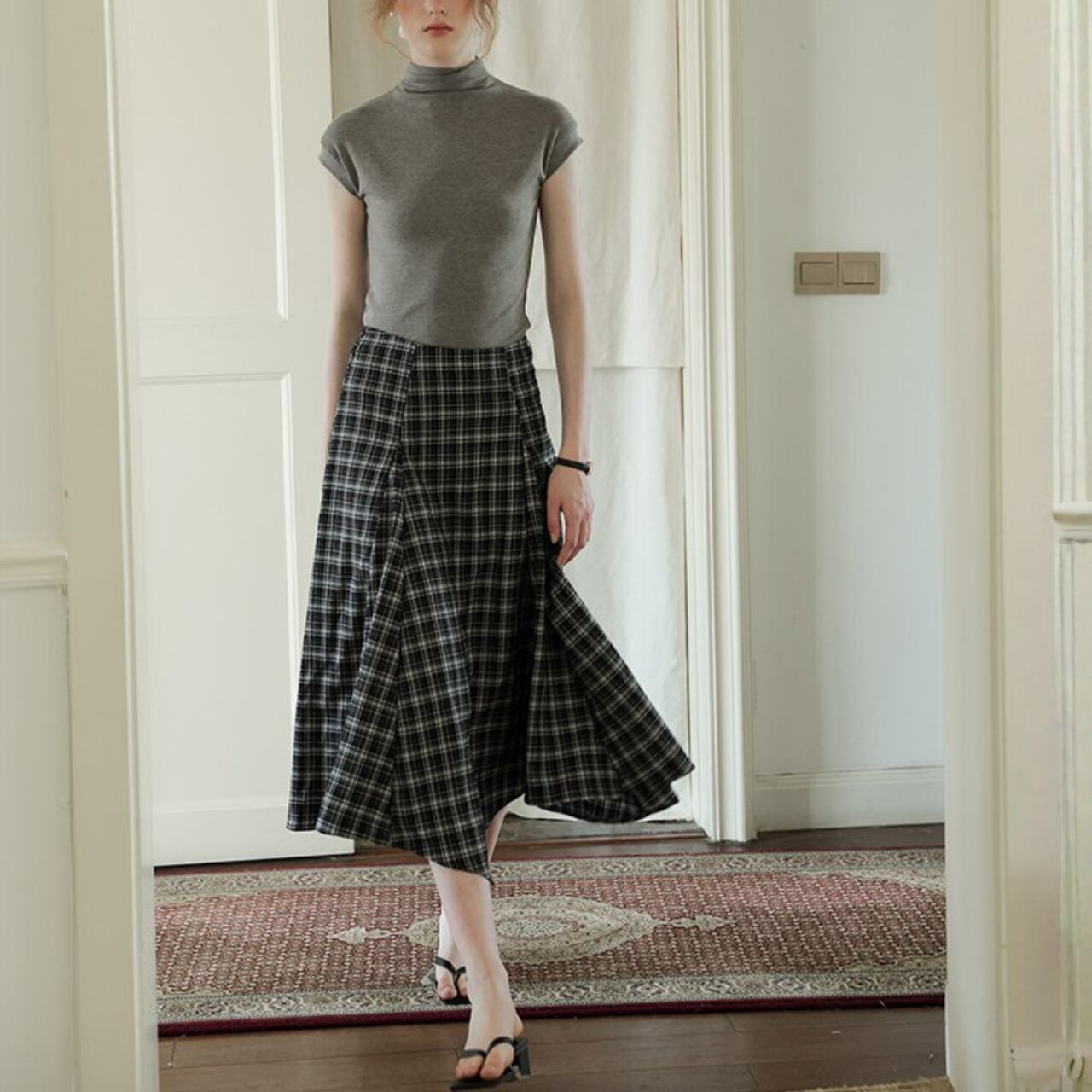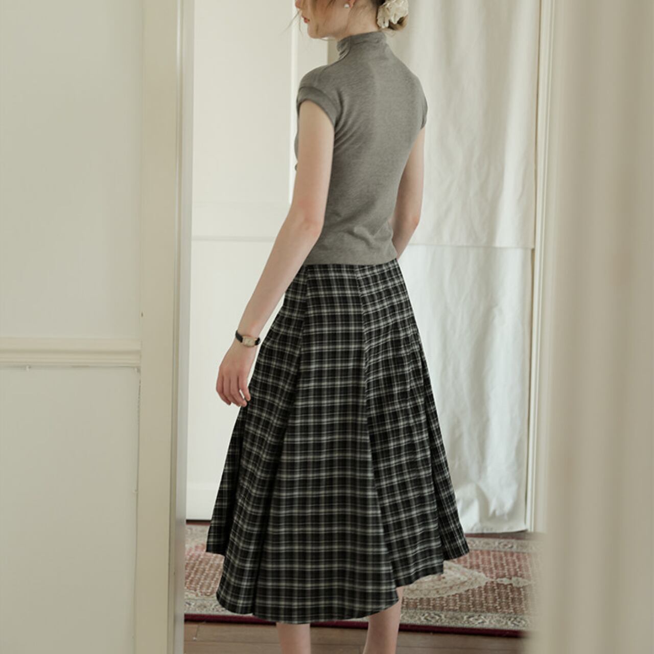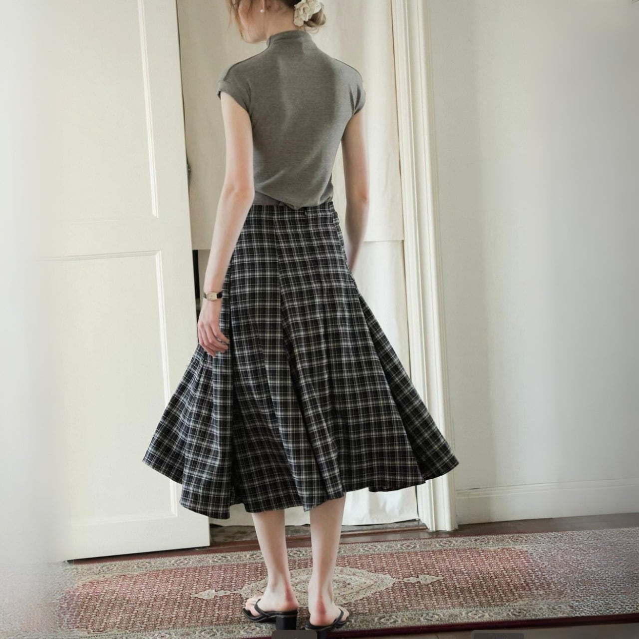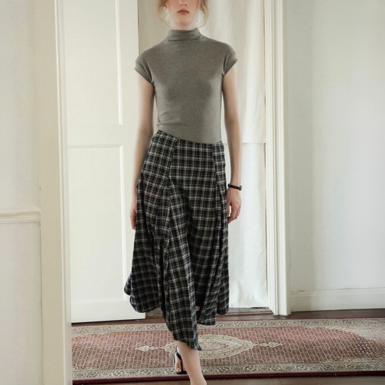 シルエットに動きが出る、チェックのフレアスカート。