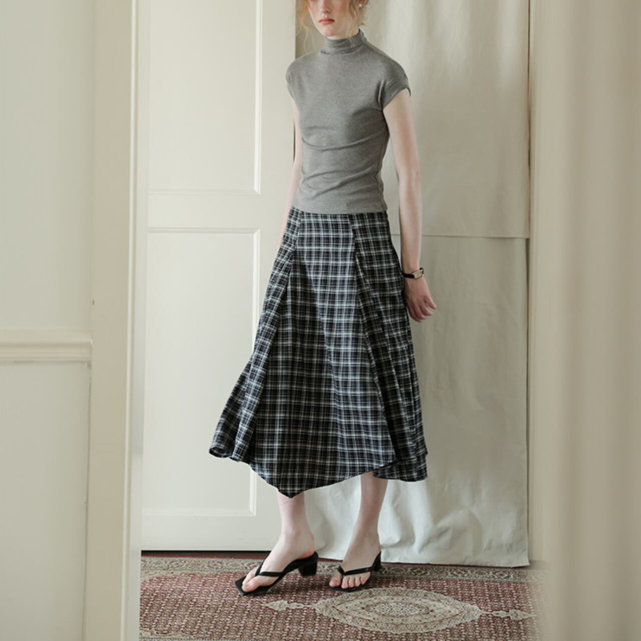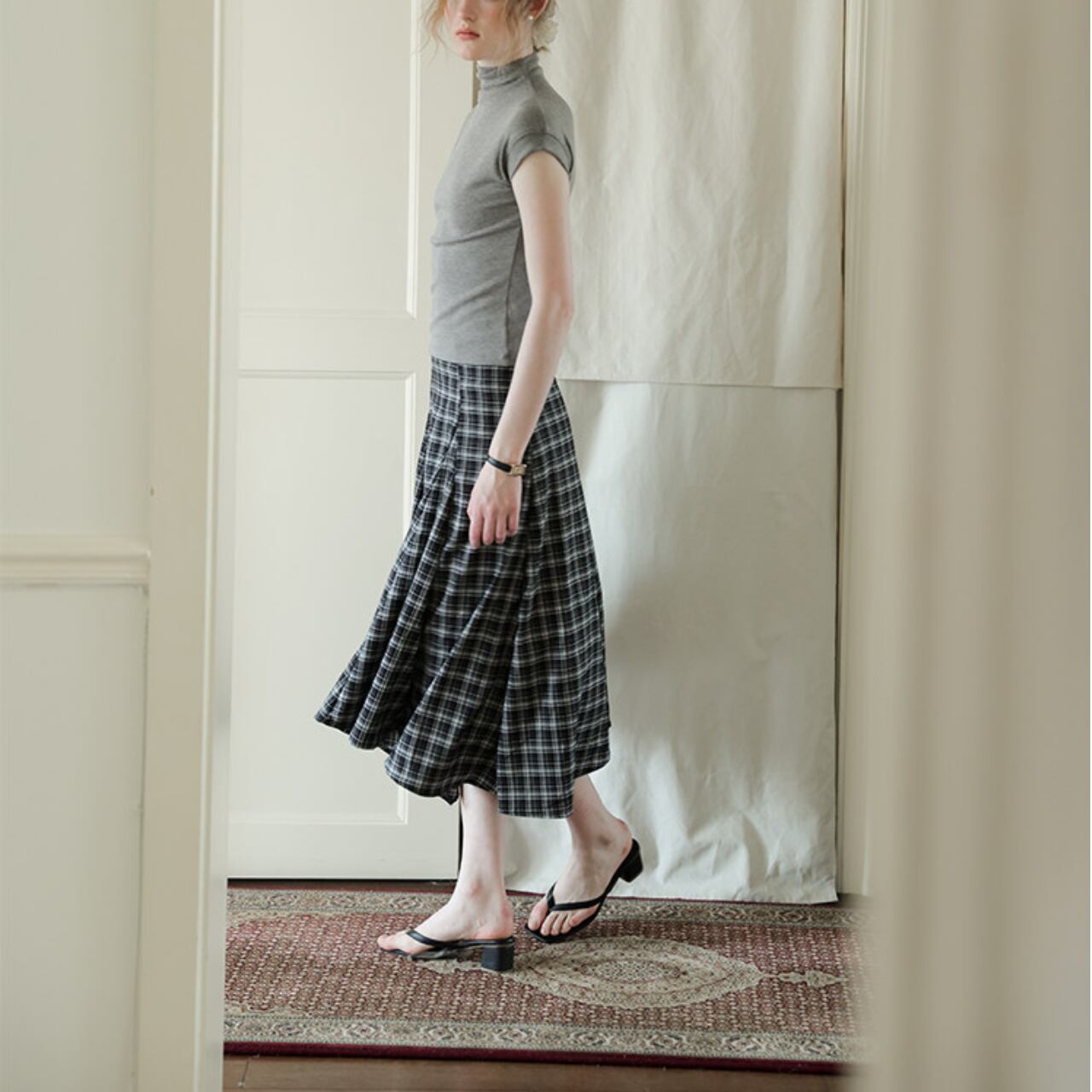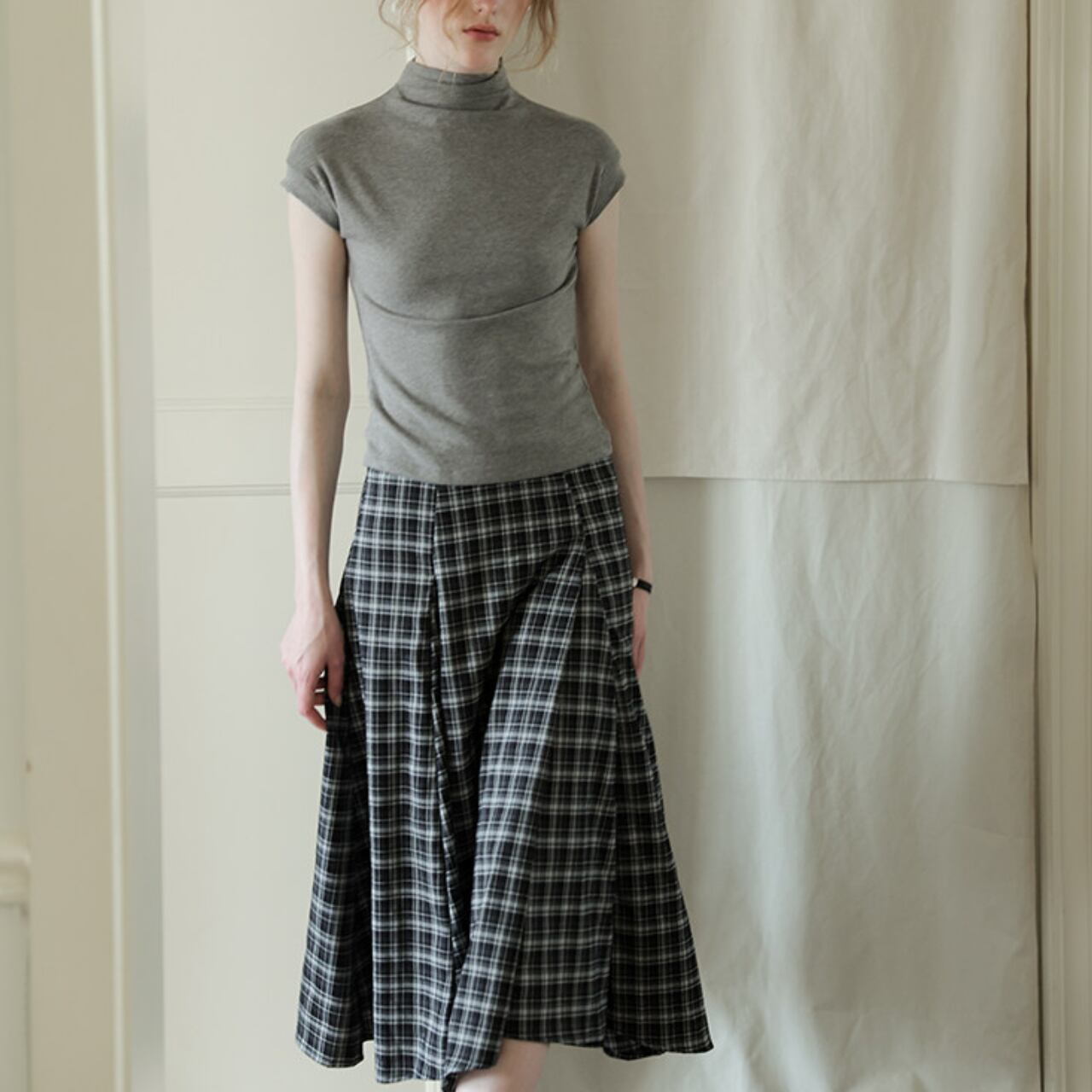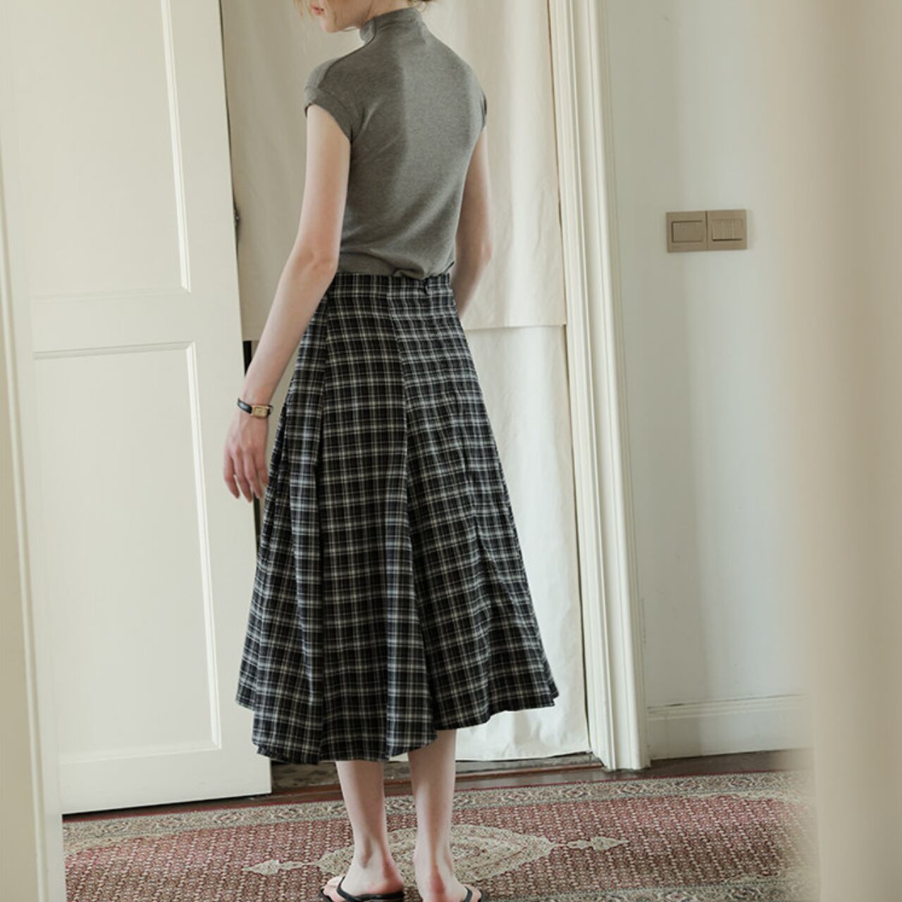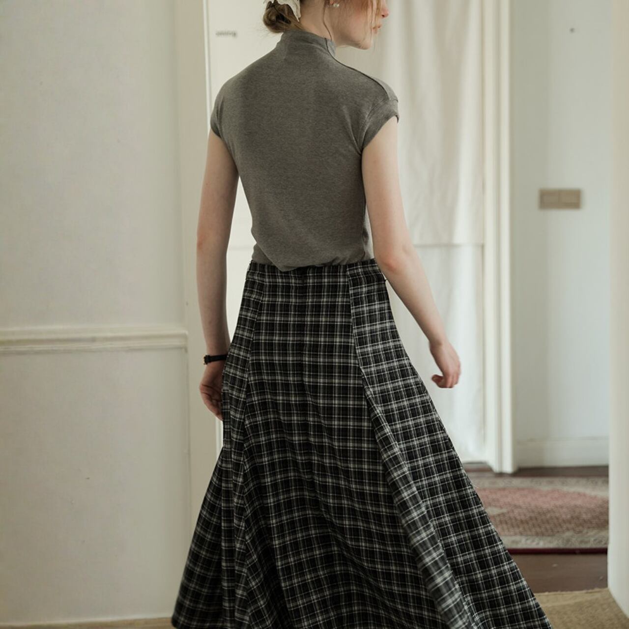 シルエットに動きが出る、チェックのフレアスカート。