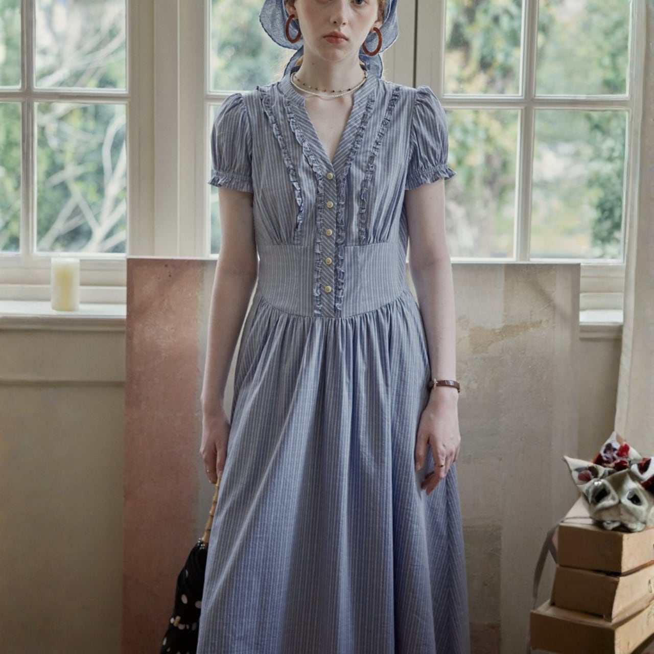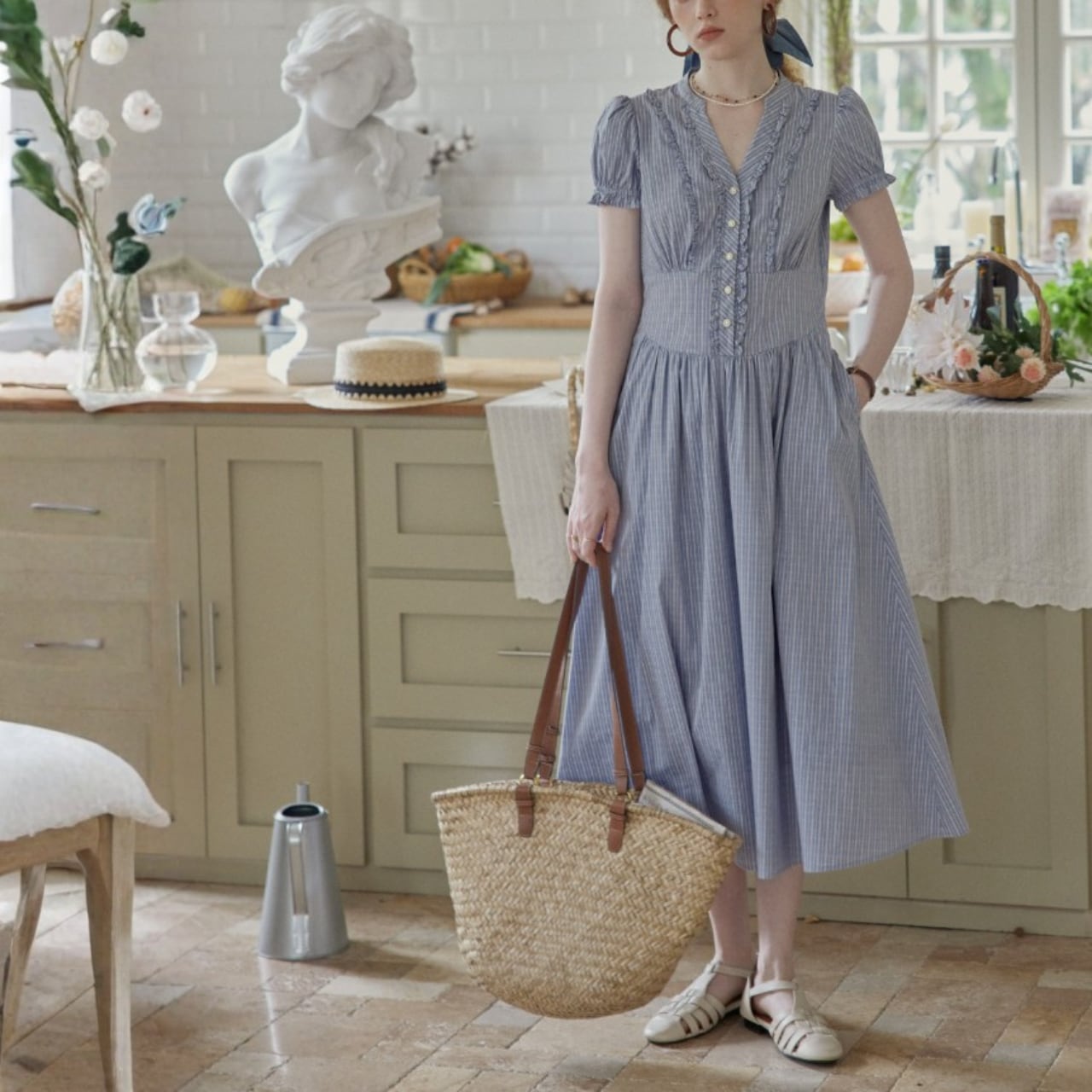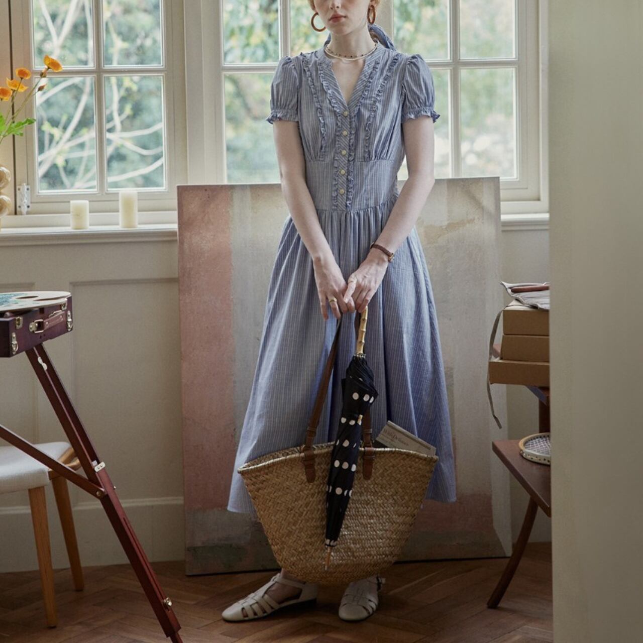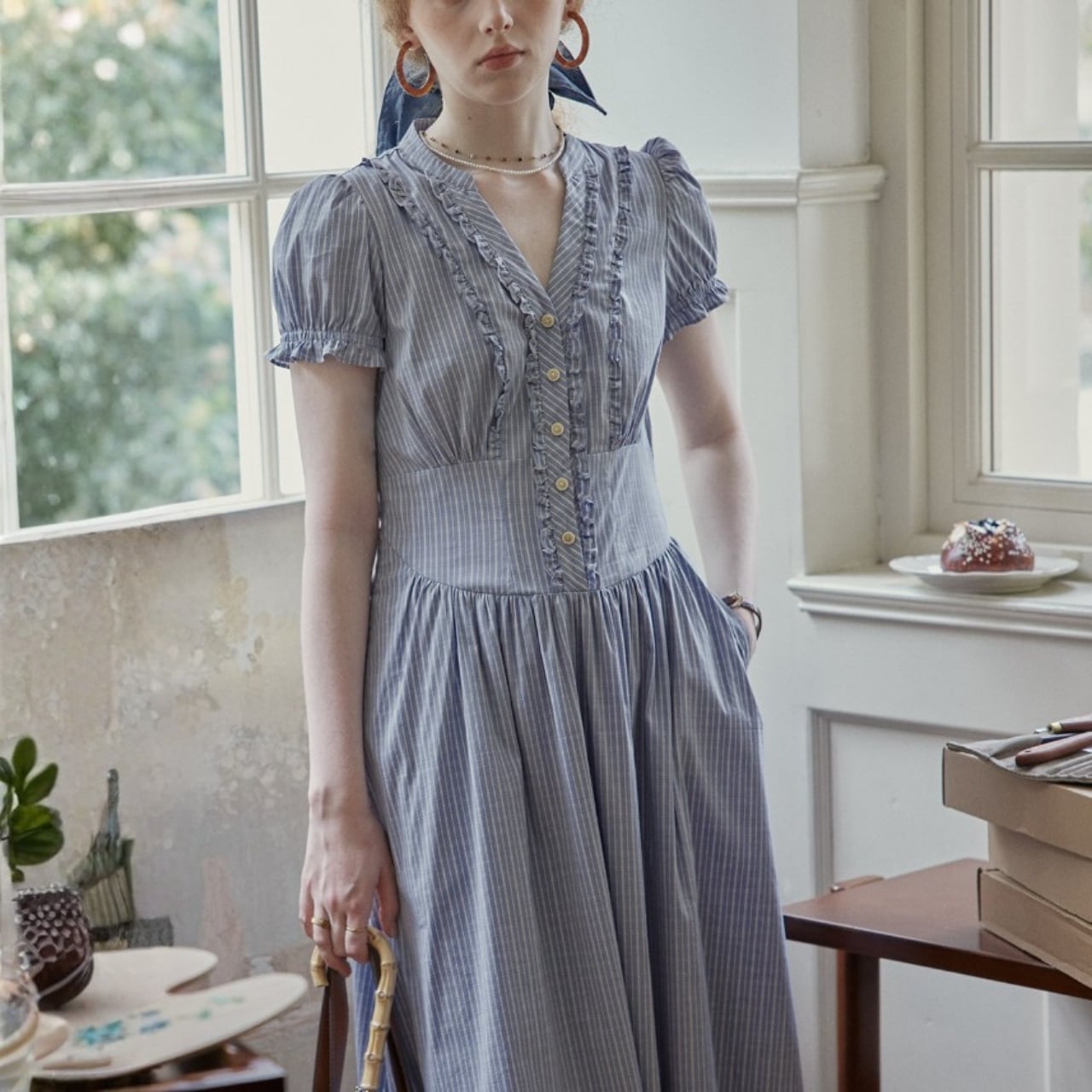 袖はコンパクトなパフスリーブ、ウエストはやや高めの切替で、上半身をすっきり見せながら、下はギャザーで自然に広がるシルエット。