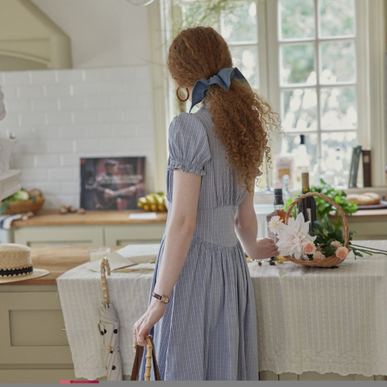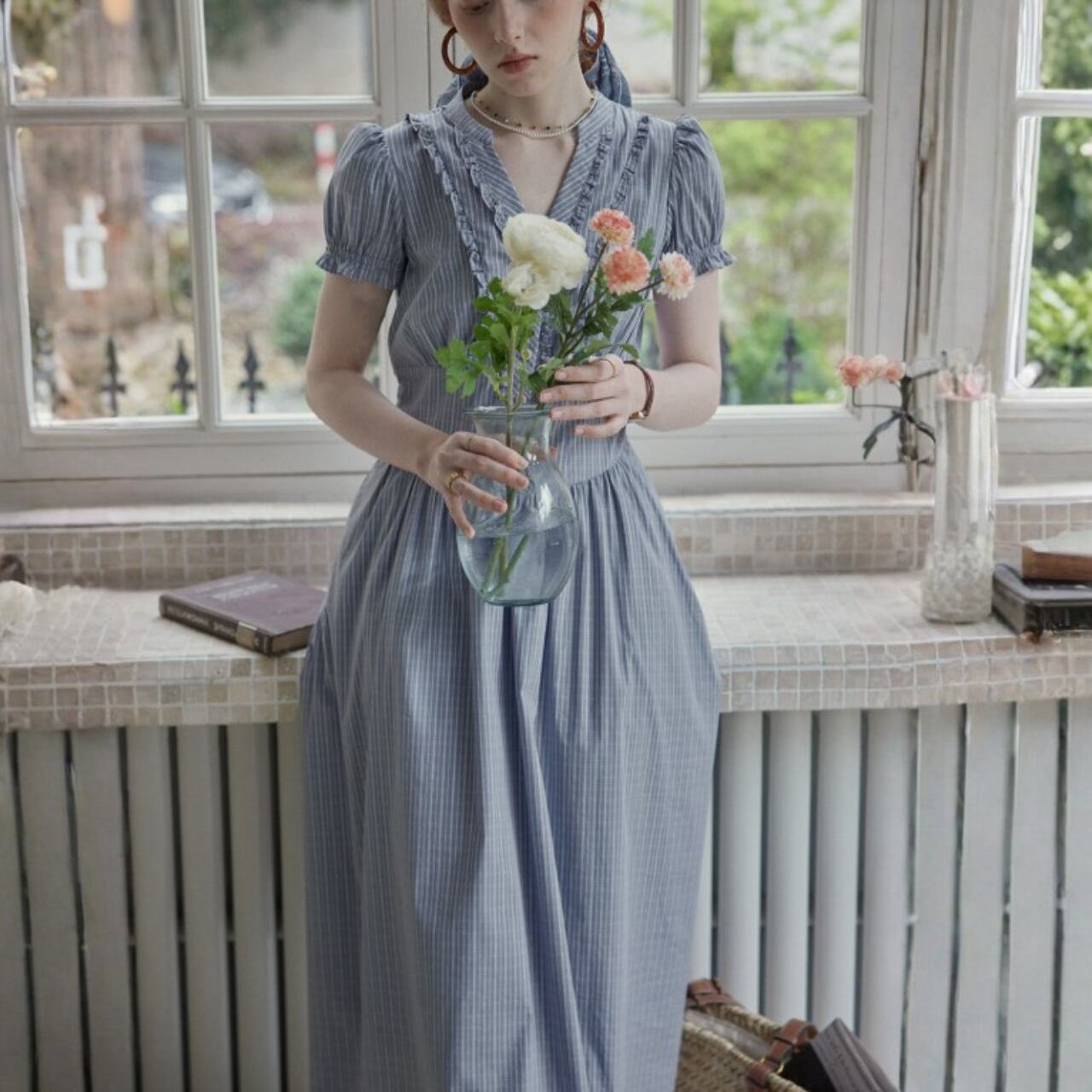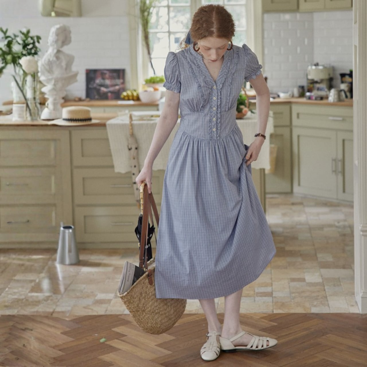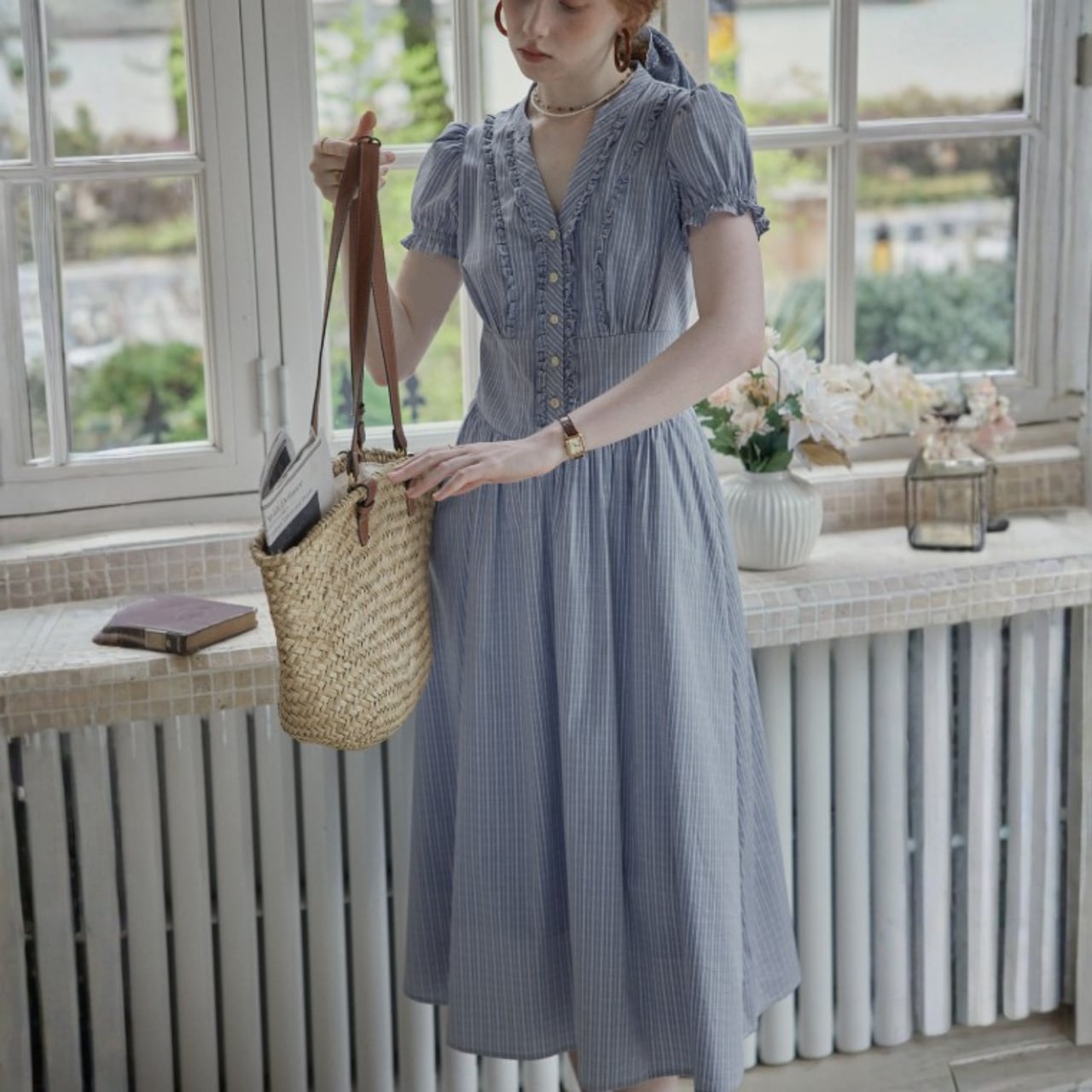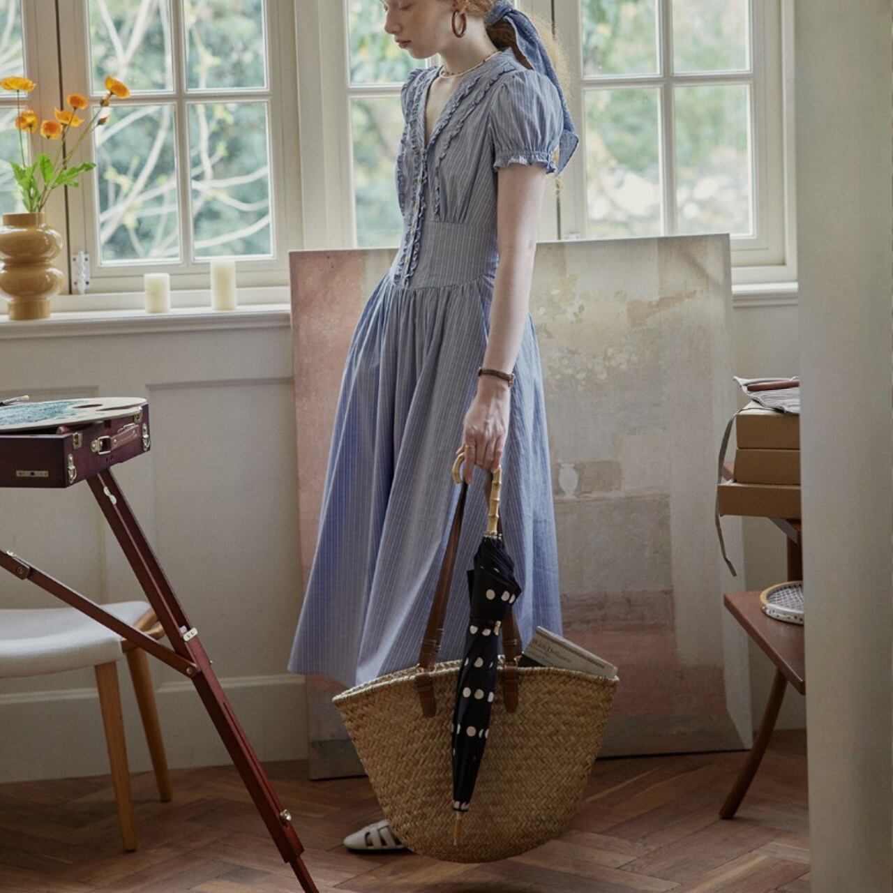 袖はコンパクトなパフスリーブ、ウエストはやや高めの切替で、上半身をすっきり見せながら、下はギャザーで自然に広がるシルエット。