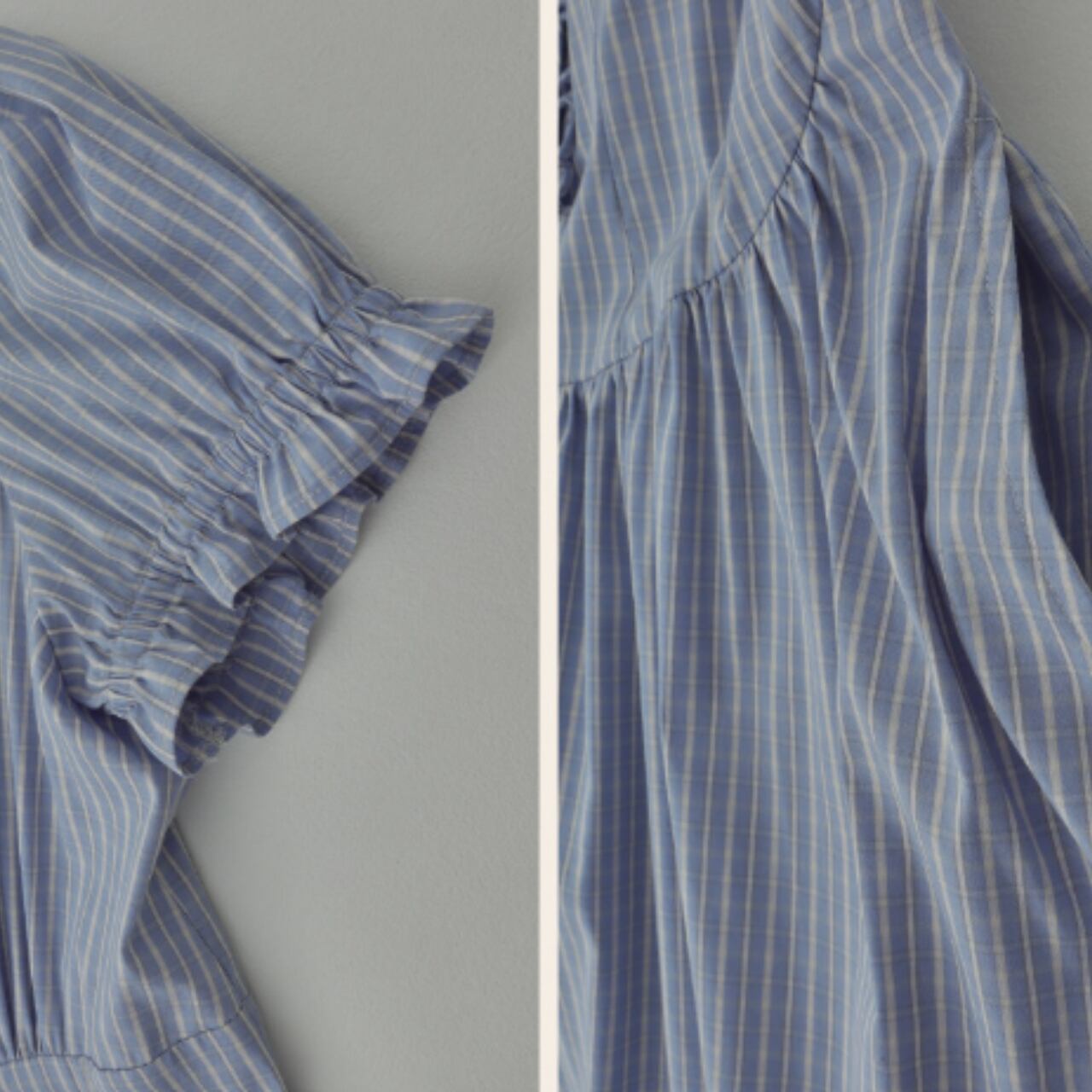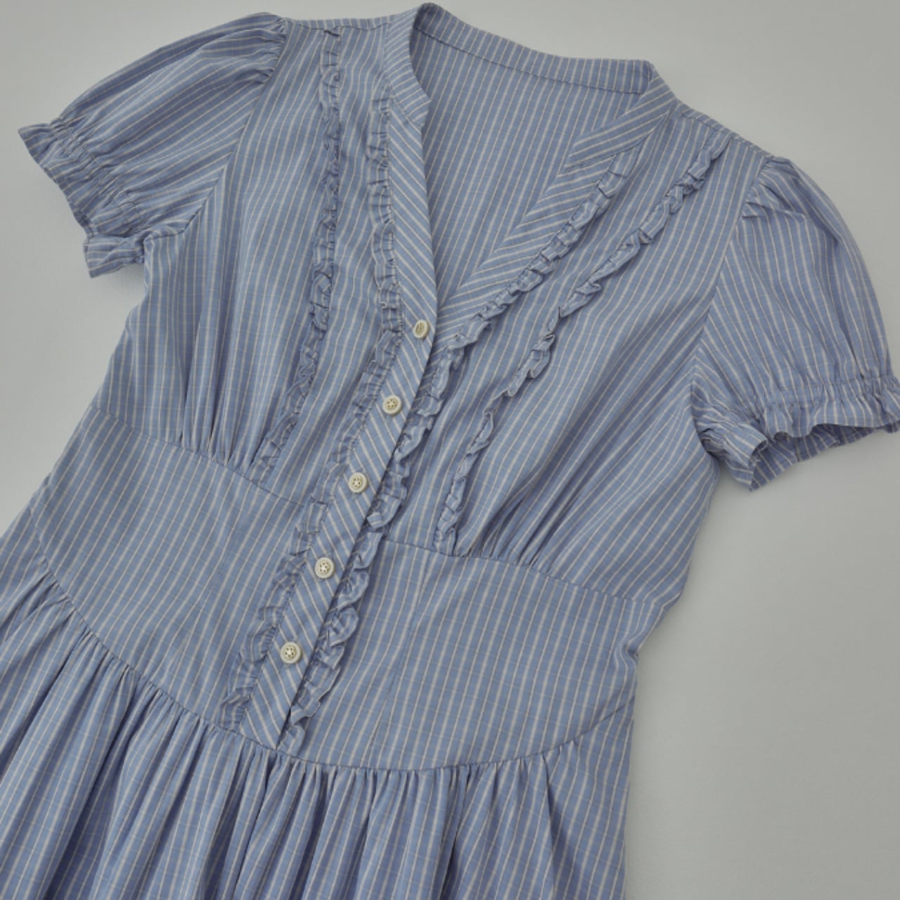 細かなストライプの生地に、フロントはフリルを縦に走らせたデザイン。