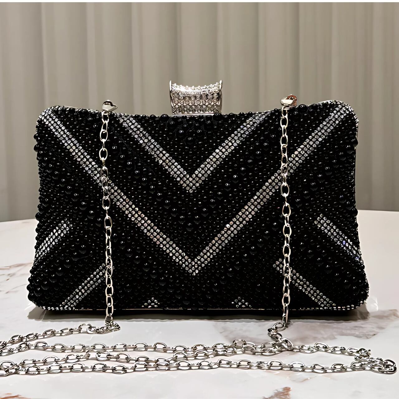 シックなブラックと上品なシルバーの組み合わせが魅力的なクラッチバッグ。