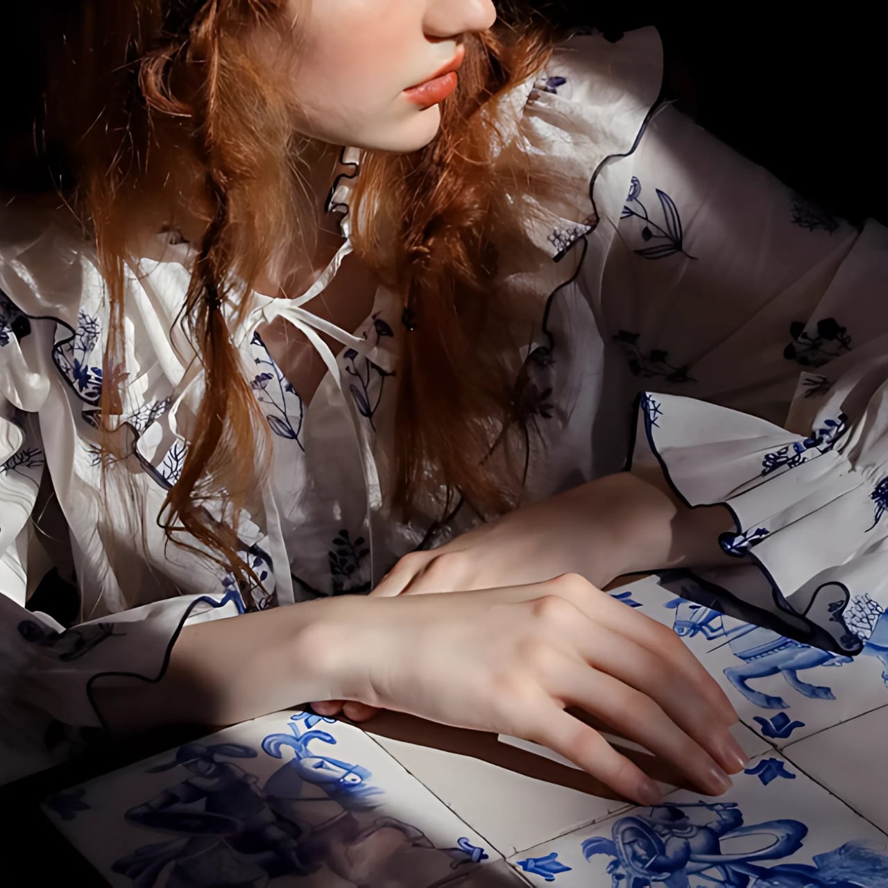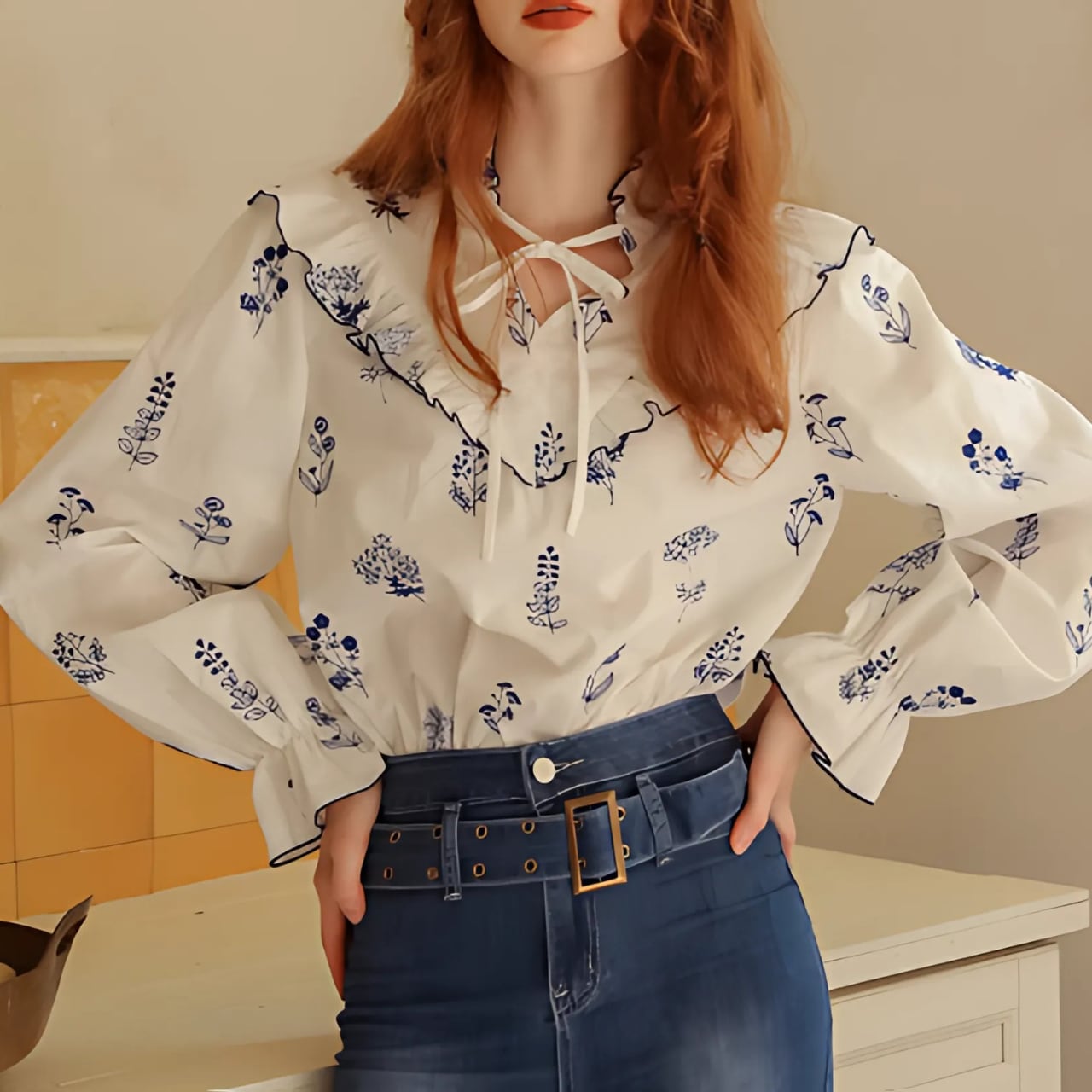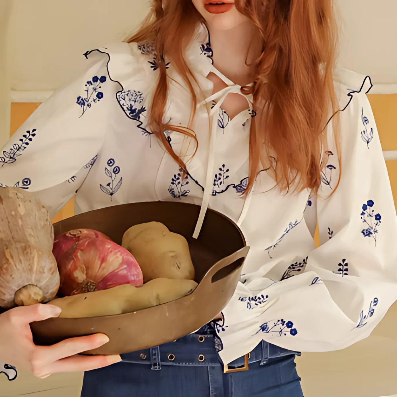 繊細なブルーの花柄が、白い生地に映える美しいブラウス。