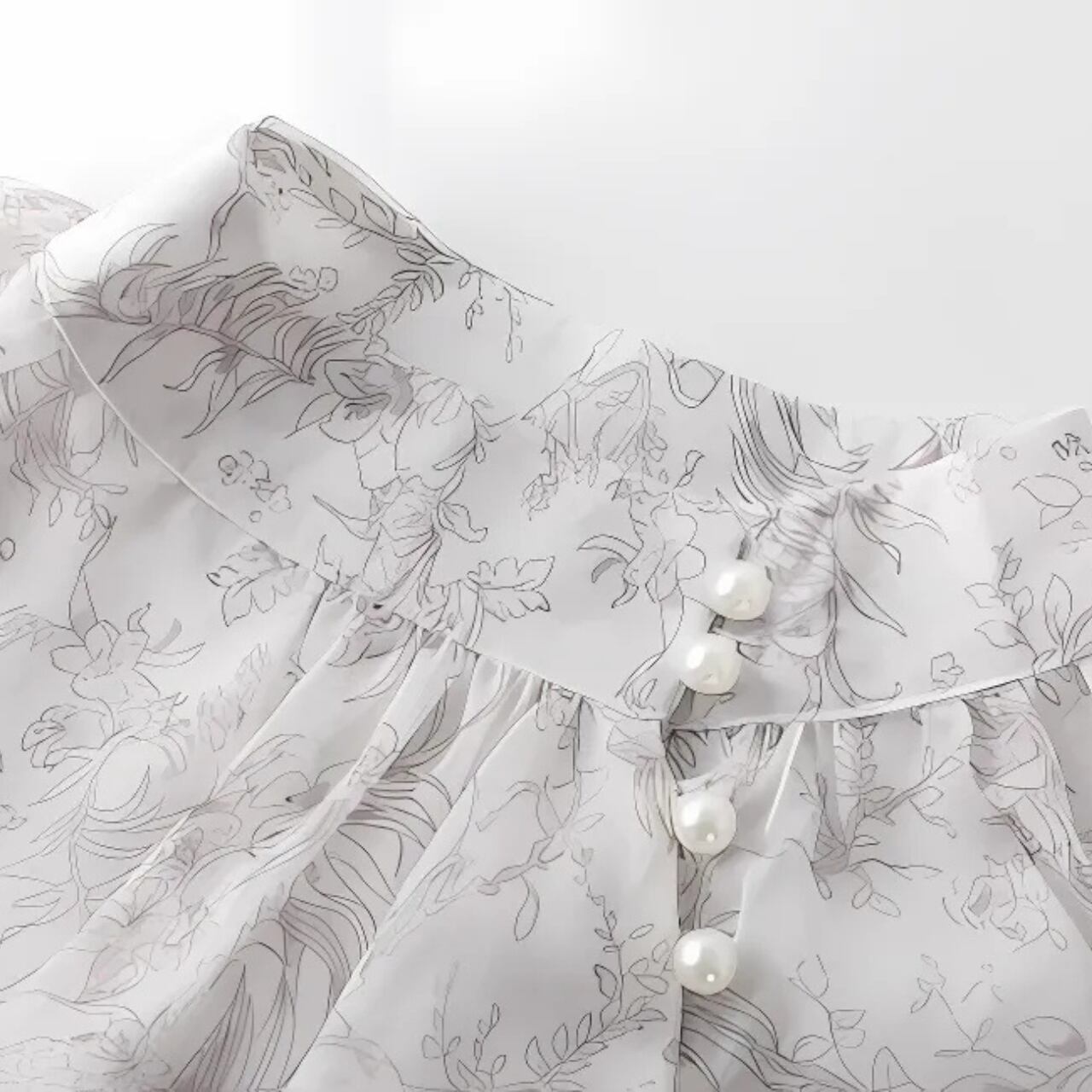 上品なパールボタンがアクセントになった、スタンドカラーのシフォンブラウス。