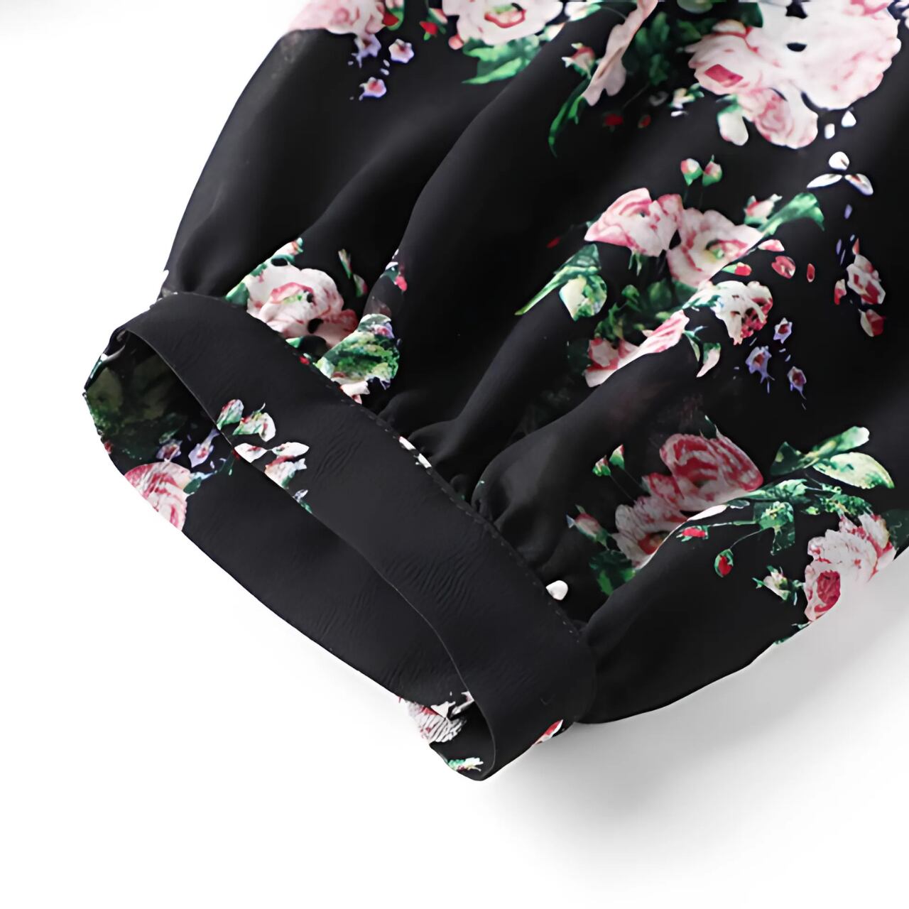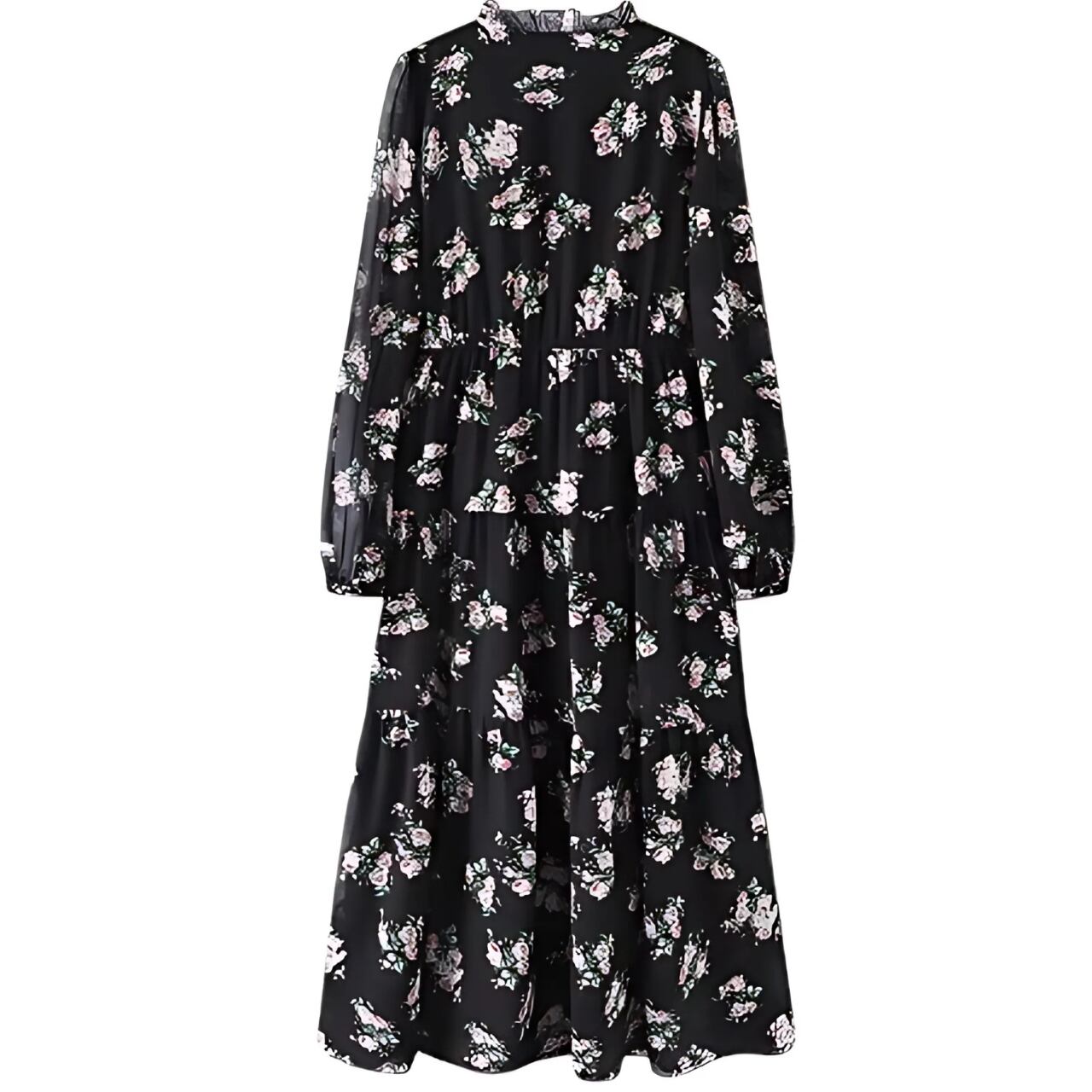 落ち着いた色合いの花柄が魅力的なロングドレス。