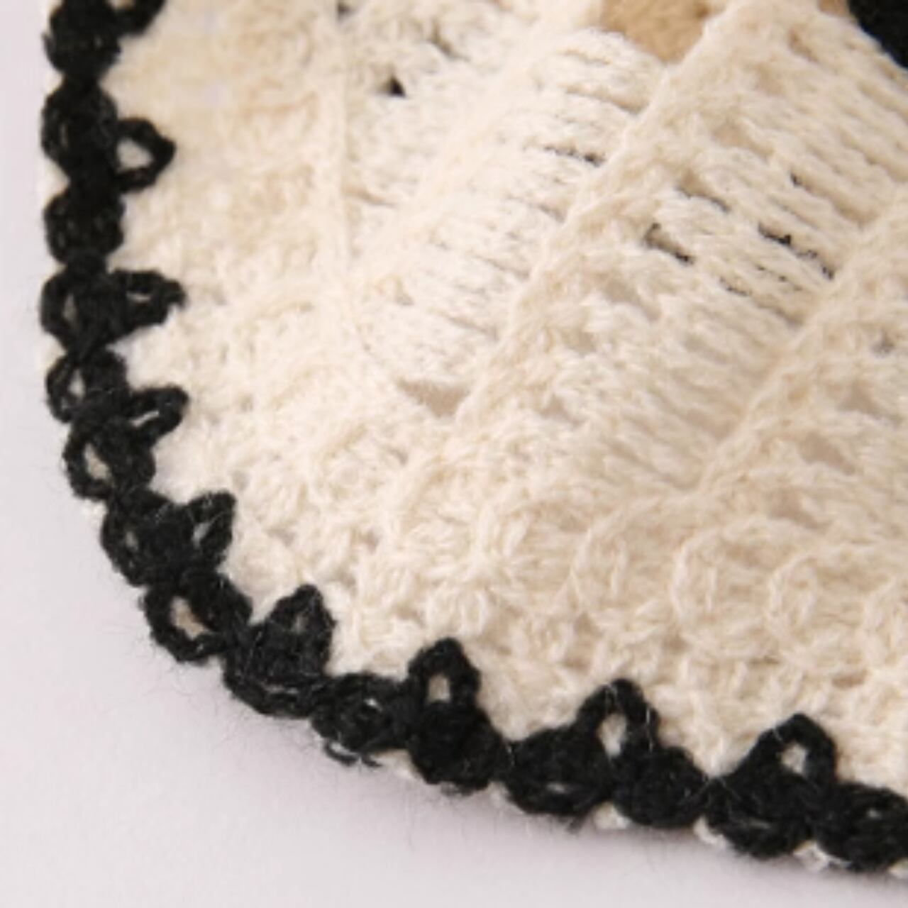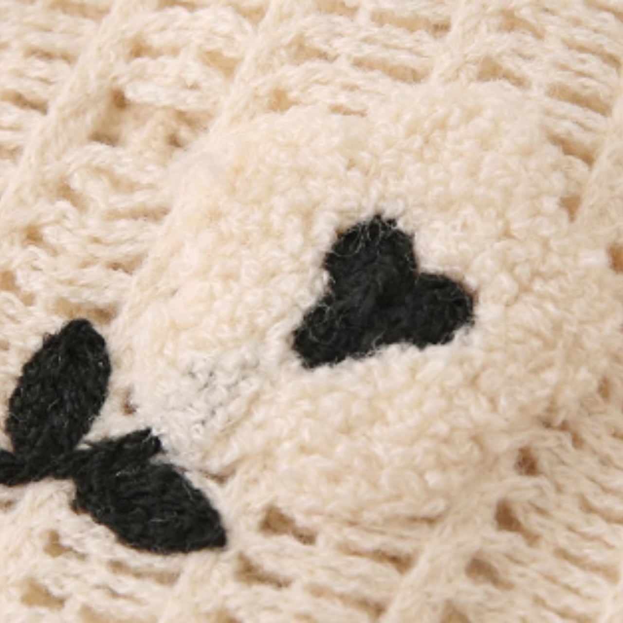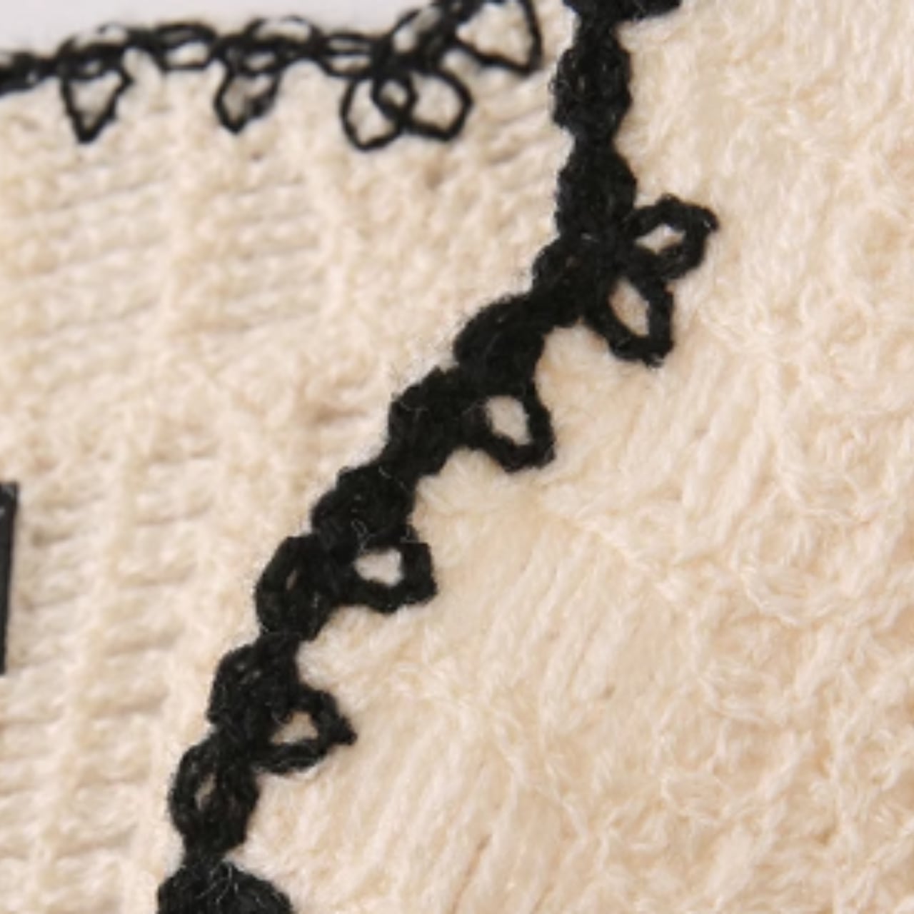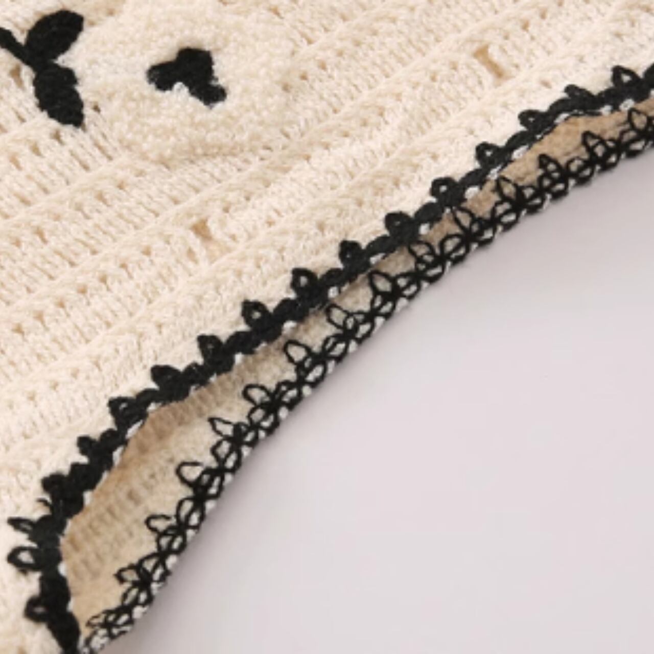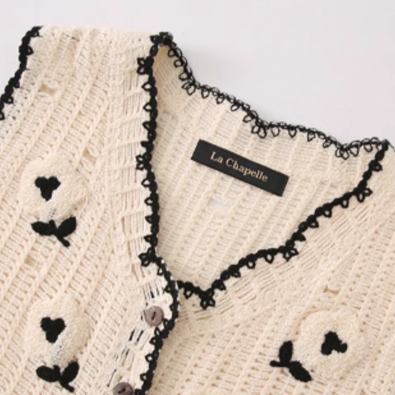 クロシェ編みのニットベストは、さり気なく施された花モチーフが、着こなしに華やかさを添えます。