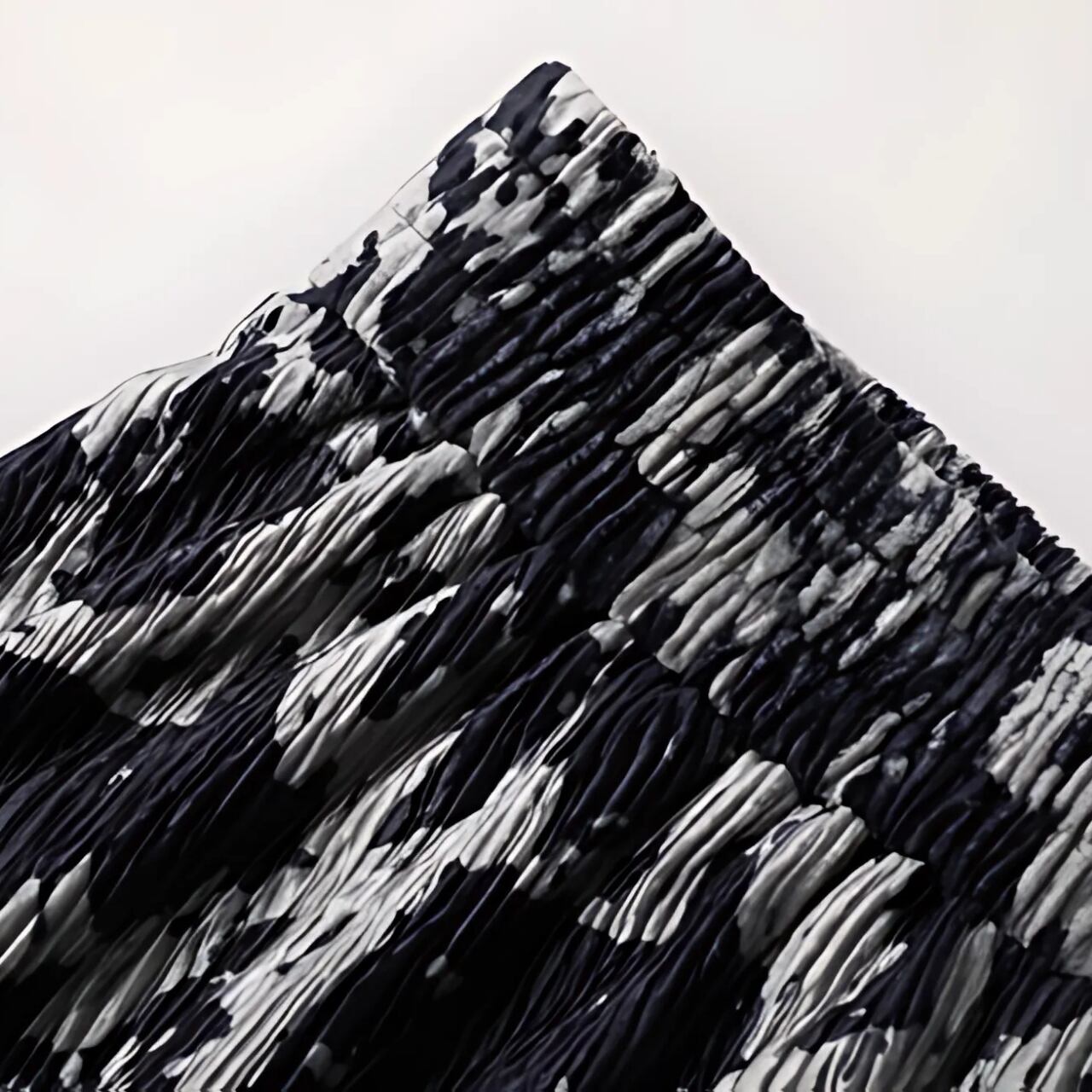 ウエストはゴム仕様で快適な着心地です。落ち着いた色合いのプリント柄は、甘すぎず大人っぽい印象。