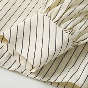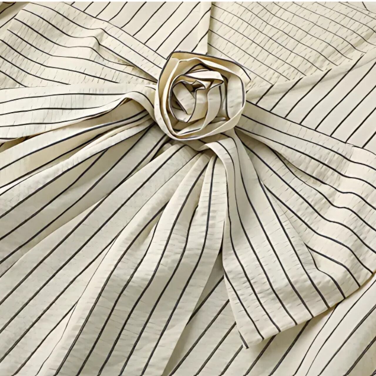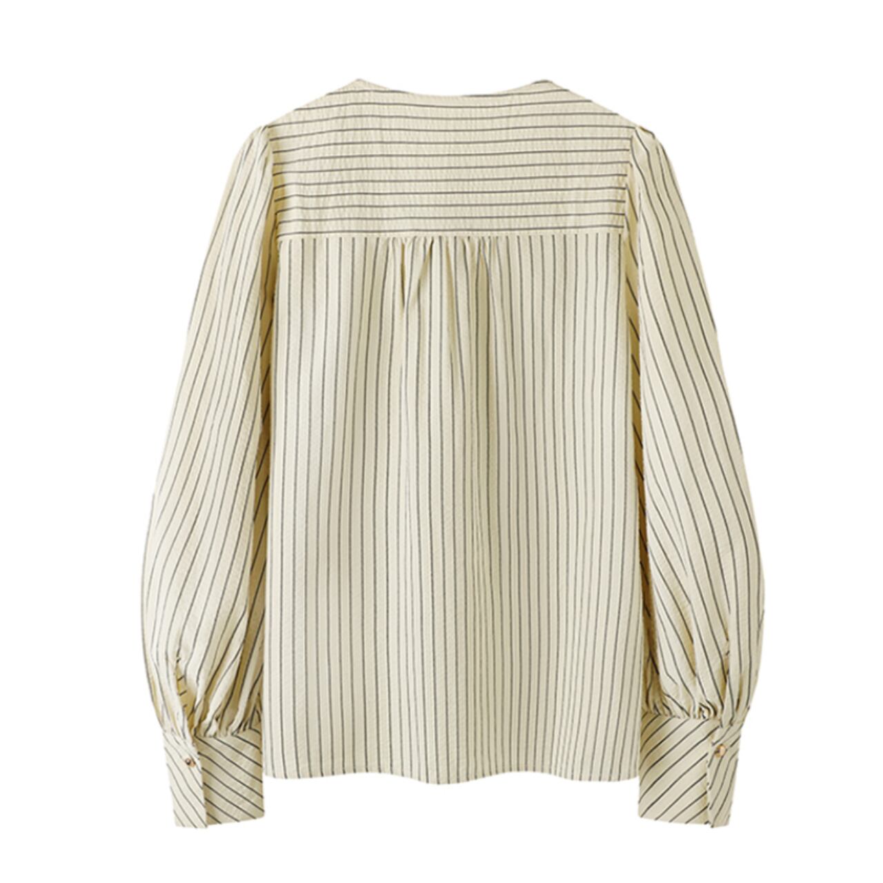 洗練されたストライプ柄と、可愛らしいリボンが魅力的なブラウス。